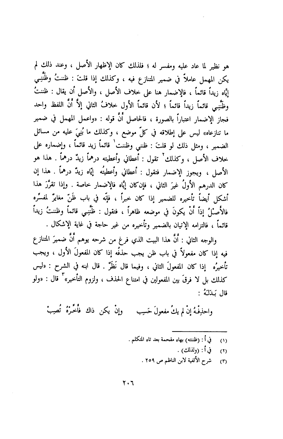 والوجه الثاني: أن هذا البيت الذي فرغ من شرحه يوهم أن ضمير المتنازع فيه إذا كان مفعولًا في باب ظن يجب حذفه إذا كان المفعول الأول، ويجب تأخيره إذا كان المفعول الثاني، وفيما قال نظر. قال ابنه في الشرح: "ليس كذلك بل لا فرق بين المفعولين في امتناع الحذف، ولزوم التأخير" قال: "ولو قال بدله: