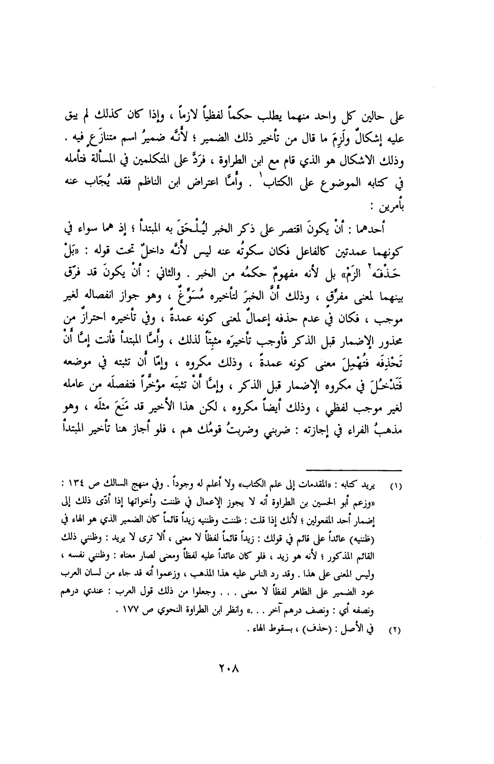 على حالين كل واحد منهما يطلب حكمًا لفظيًا لازمًا، وإذا كان كذلك لم يبق عليه إشكالٌ ولزم ما قال من تأخير ذلك الضمير؛ لأنه ضمير اسم متنازعٍ فيه. وذلك الإشكال هو الذي قام مع ابن الطراوة، فرد على المتكلمين في المسألة فتأمله في كتابه الموضوع على الكتاب. وأما اعتراض ابن الناظم فقد يجاب عنه بأمرين: