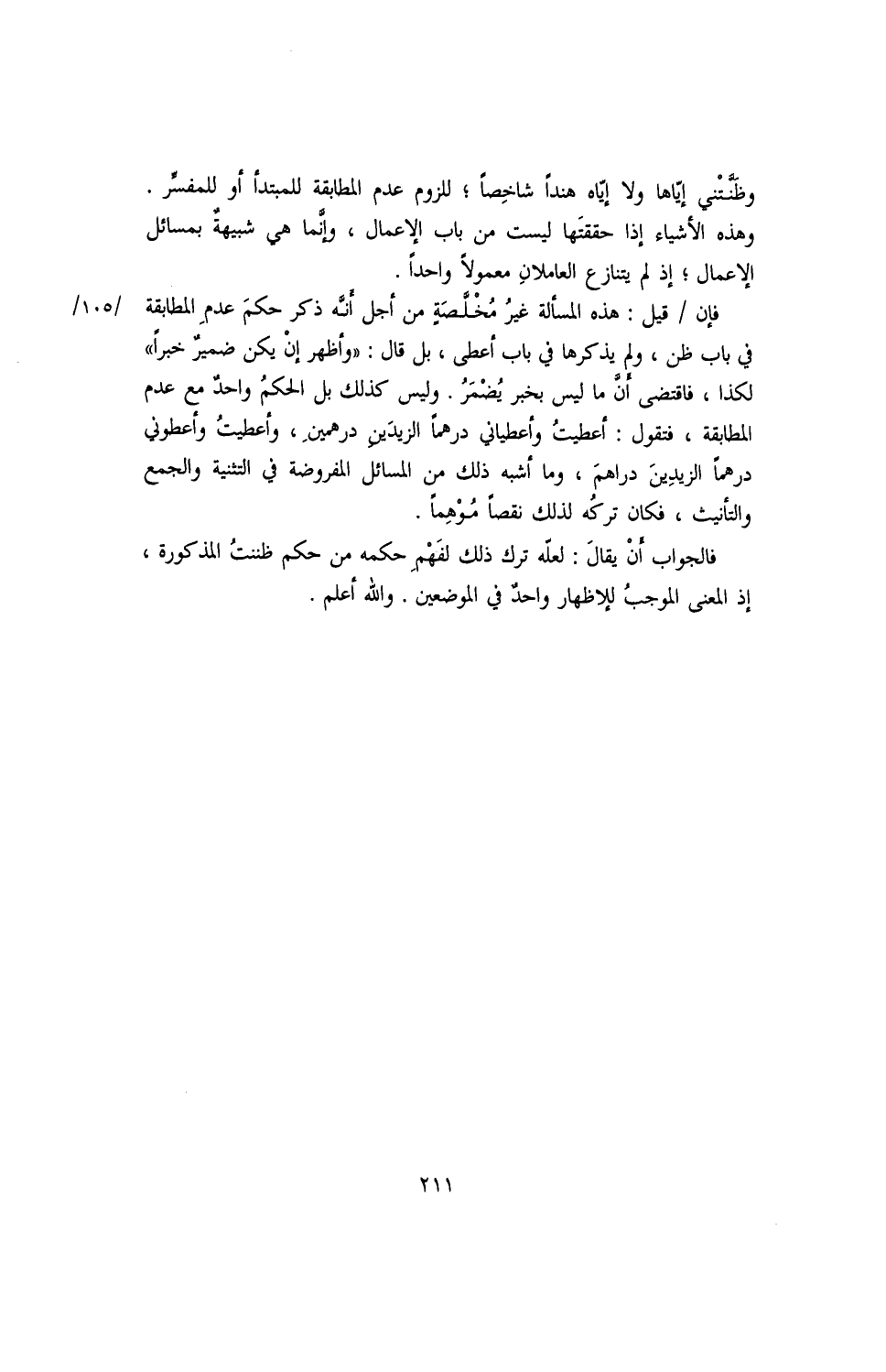فإن قيل: هذه المسألة غير مُخْلَّصة من أجل أنّه ذكر حكم عدمِ المطابقة في باب ظن، ولم يذكرها في باب أعطى، بل قال: "وأظهر إنْ يكن ضميرٌ خبرًا" لكذا، فاقتضى أنّ ما ليس بخبر يُضمَر. وليس كذلك بل الحكم واحد من عدم المطابقة، فتقول: أعطيت وأعطياني درهمًا الزيدين درهمين، وأعطيتُ وأعطوني درهمًا الزيدين دراهم، وما أشبه ذلك من المسائل المفروضة في التثنية والجمع والتأنيث، فكان تركه لذلك نقصًا مُوهِمًا.
