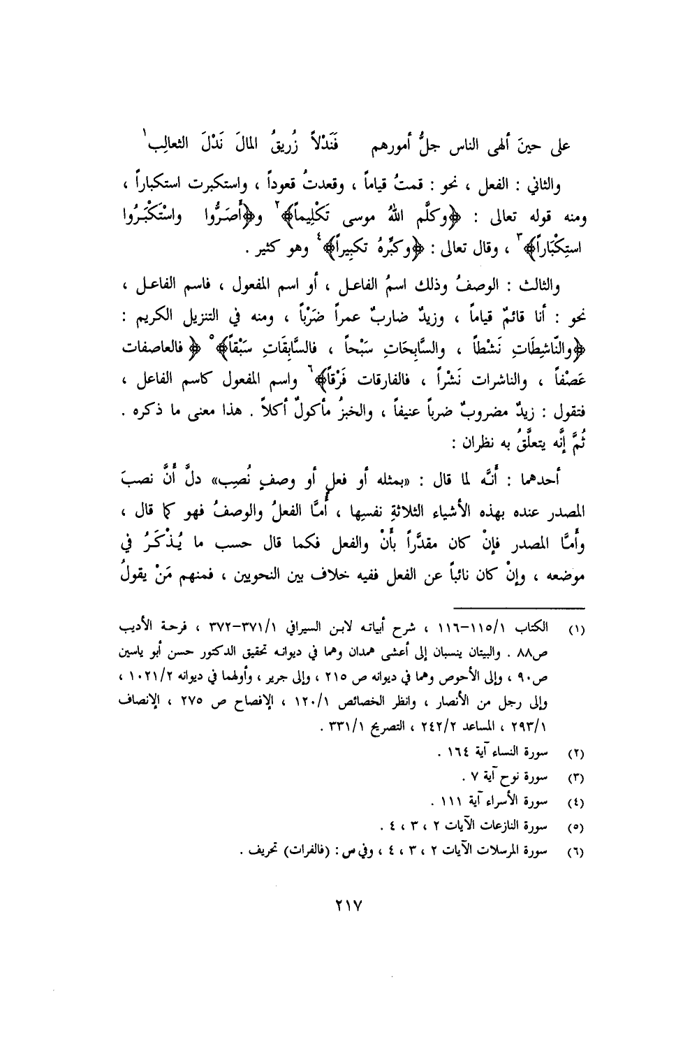 والثالث: الوصف وذلك اسم الفاعل، أو اسم المفعول، فاسم الفاعل، نحو: أنا قائم قيامًا، وزيد ضارب عمرًا ضربًا، ومنه في التنزيل الكريم: {والنَّاشِطات نشْطًا، والسَّابِحات سبْحًا، فالسَّابِقات سبْقا} {فالعاصفات عصْفًا، والناشرات نشْرًا، فالفارقات فرْقًا} واسم المفعول كاسم الفاعل، فتقول: زيد مضروب ضربًا عنيفًا، والخبزُ مأكولٌ أكلًا. هذا معنى ما ذكره. ثم إنه يتعلق به نظران: