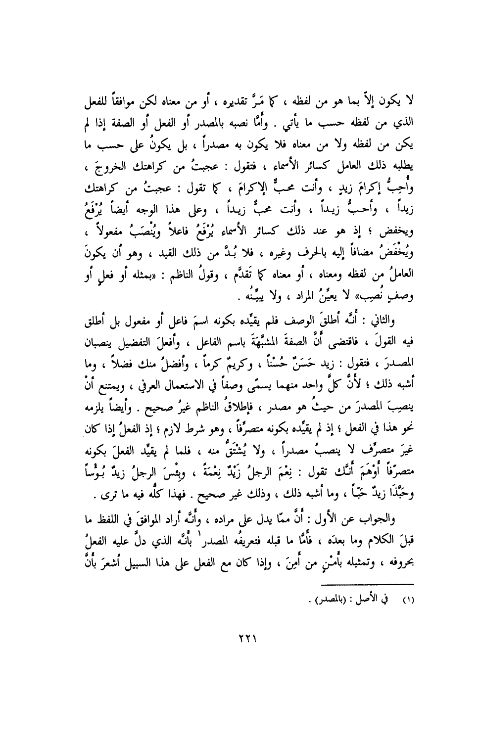 والثاني: أنّه أطلق الوصف فلم يقيّده بكونه اسم فاعل أو مفعول بل أطلق فيه القول، فاقتضى أنّ الصفة المشبَّهَة باسم الفاعل، وأفعل التفضيل ينصبان المصدر، فتقول: زيد حسنٌ حُسنًا، وكريمٌ كرمًا، وأفضل منك فضلًا، وما أشبه ذلك؛ لأن كل واحد منهما يسمّى وصفًا في الاستعمال العرفي، ويمتنع أن ينصِبَ المصدر من حيث هو مصدر، فإطلاق الناظم غير صحيح. وأيضًا يلزمه نحو هذا في الفعل؛ إذ لم يقيّده بكونه متصرّفًا، وهو شرط لازم؛ إذ الفعلُ إذا كان غير متصرّف لا ينصب مصدرًا، ولا يُشتَقُّ منه، فلما لم يقيّد الفعل بكونه متصرفًا أوَهَم أنك تقول: نِعم الرجل زيدٌ نعمةً، وبئس الرجل زيدٌ بؤسًا وحبَّذا زيدٌ حبًا، وما أشبه ذلك، وذلك وغير صحيح. فهذا كله فيه ما ترى.