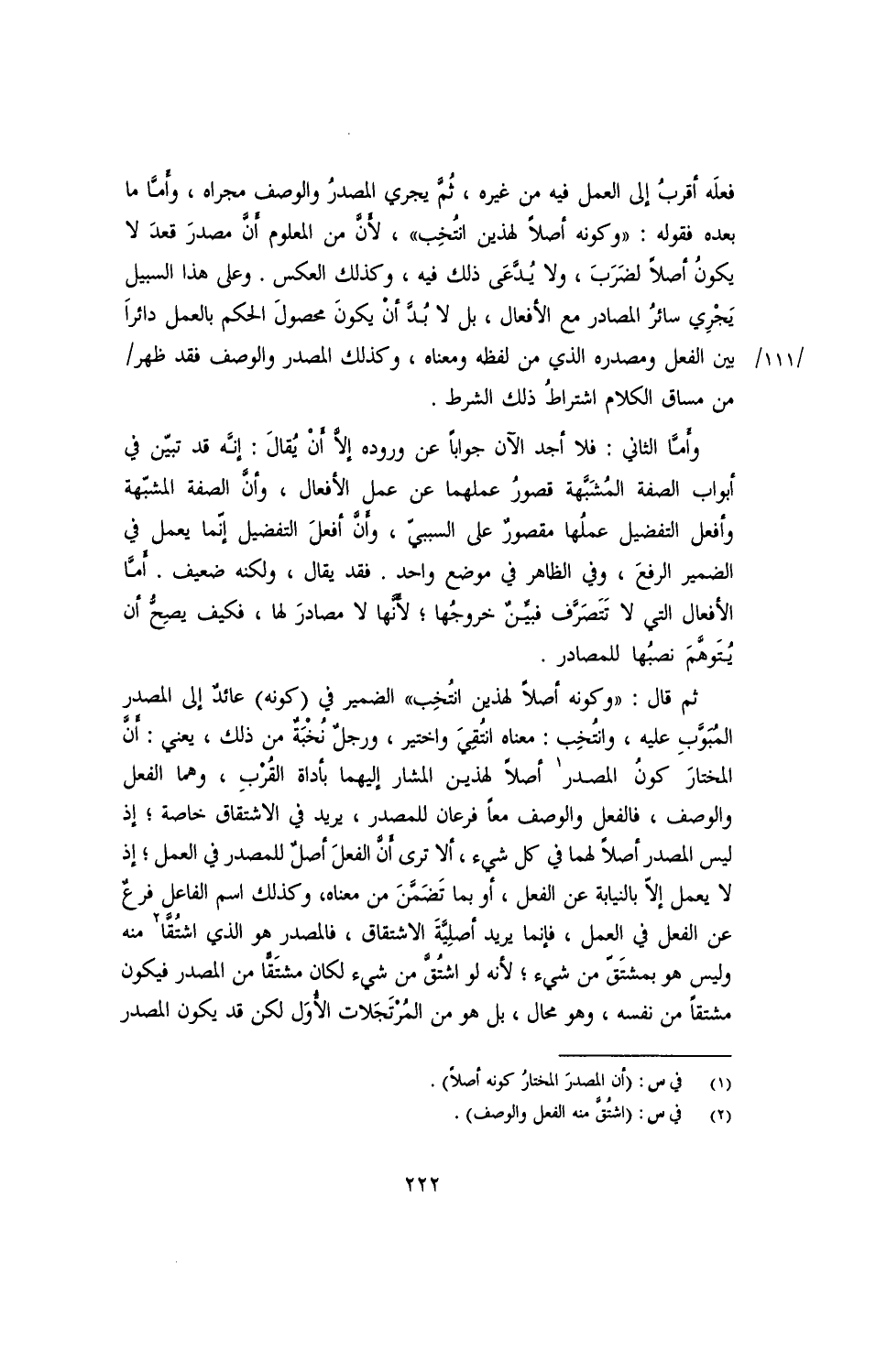 ثم قال: " وكونه أصلًا لهذين انتُخِب" الضمير في (كونه) عائد إلى المصدر المُبَوَّب عليه، وانتُخِب: معناه انتُقِيَ واختير، ورجل نُخبَةٌ من ذلك، يعني: أنَّ المختار كون المصدر أصلًا لهذين المشار إليهما بأداة القُربِ، وهما الفعل والوصف، فالفعل والوصف معًا فرعان للمصدر، يريد في الاشتقاق خاصّة؛ إذ ليس المصدر أصلًا لهما في كل شيء، ألا ترى أن الفعل أصلٌ للمصدر في العمل؛ إذ لا يعمل إلا بالنيابة عن الفعل، أو بما تضمّن من معناه، وكذلك اسم الفاعل فرع عن الفعل في العمل، فإنما يريد أصليَّة الاشتقاق، فالمصدر هو الذي اشتُقَّا منه وليس هو بمشتقّ من شيء؛ لأن لو اشتُقَّ من شيء لكان مشتقًّا من المصدر فيكون مشتقًا من نفسه، وهو محال، بل هو من المُرتَجَلات الأُوَل لكن قد يكون المصدر