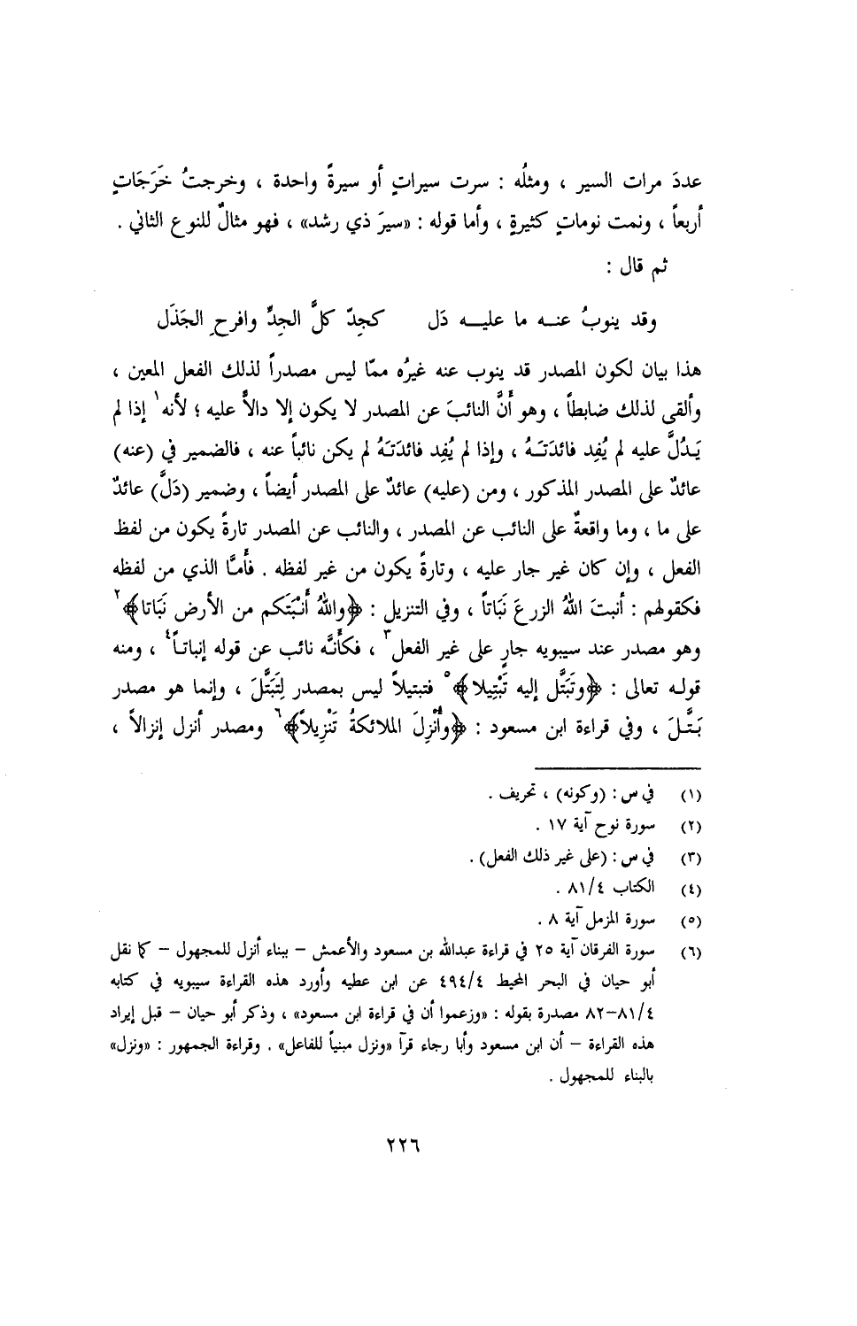 هذا بيان لكون المصدر قد ينوب عنه غيره مما ليس مصدرًا لذلك الفعل المعين، وألقى لذلك ضابطًا، وهو أن النائب عن المصدر لا يكون إلا دالًّا عليه؛ لأنه إذا لم يدل عليه لم يُفِد فائدته، وإذا لم يُفِد فائدته لم يكن نائبًا عنه، فالضمير في (عنه) عائدٌ على المصدر المذكور، ومن (عليه) عائدٌ على المصدر أيضًا، وضمير (دَلّ) عائد على ما، وما واقعة على النائب عن المصدر، والنائب عن المصدر تارة يكون من لفظ الفعل، وإن كان غير جار عليه، وتارة يكون من غير لفظه. فأمّا الذي من لفظه فكقولهم: أنبت الله الزرع نباتًا، وفي التنزيل: {والله أنبتكم من الأرض نباتًا} وهو مصدر عن سيبويه جارٍ على غير الفعل، فكأنّه نائب عن قوله إنباتًا، ومنه قوله تعالى: {وتبَتَّل إليه تَبْتِلًا} فتبتيلًا ليس بمصدر لِتَبَتَّل، وإنما هو مصدر بتَّل، وفي قراءة ابن مسعود: {وأُنْزِل الملائكة تنزيلًا} ومصدر أنزل إنزالًا،