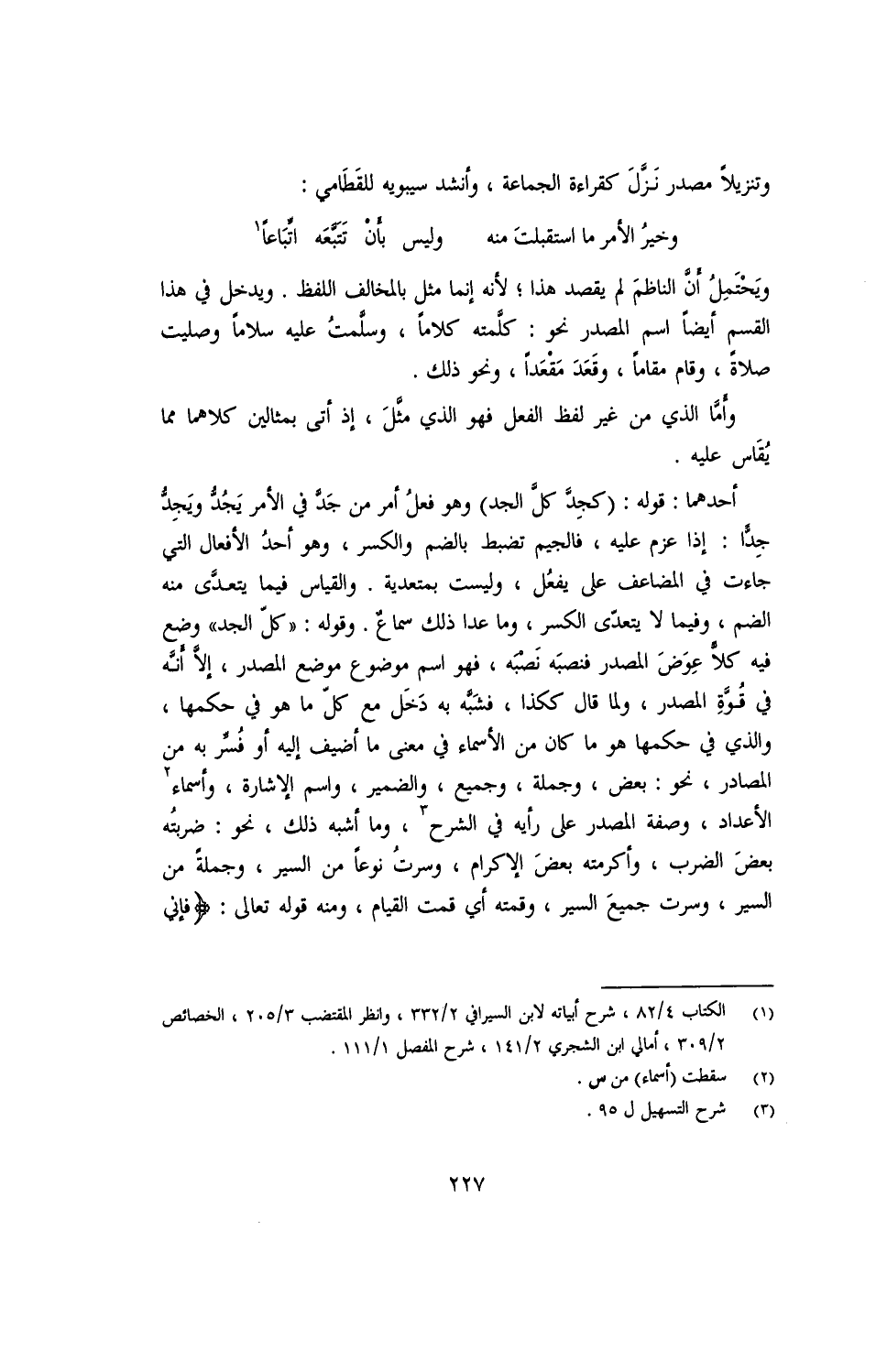 أحدهما: قوله: (كجِدَّ كل الجد) وهو فعل أمر من جَدَّ في الأمر يَجُدُّ ويَجِدُّ جِدًّا: إذا عزم عليه، فالجيم تضبط بالضم والكسر، وهو أحد الأفعال التي جاءت في المضاعف على يفعُل، وليست بمتعدية. والقياس فيما يتعدَّى منه الضم، وفيما لا يتعدّى الكسر، وما عدا ذلك سماع. وقوله: "كل الجد" وضع فيه كلًّا عِوَض المصدر فنصبه نصْبَه، فهو اسم موضوع موضع المصدر، إلَّا أنَّه في قوّة المصدر، ولما قال ككذا، فشبّه به دخل مع كل ما هو في حكمها، والذي في حكمها هو ما كان من الأسماء في معنى ما أضيف إليه أو فُسِّر به من المصادر، نحو: بعض، وجملة، وجميع، والضمير، واسم الإشارة، وأسماء الأعداد، وصفة المصدر على رأيه في الشرح، وما أشبه ذلك، نحو: ضربتُه بعض الضرب، وأكرمته بعض الإكرام، وسرتُ نوعًا من السير، وجملة من السير، وسرت جميع السير، وقمته أي قمت القمات، ومن قوله تعالى: {فإني