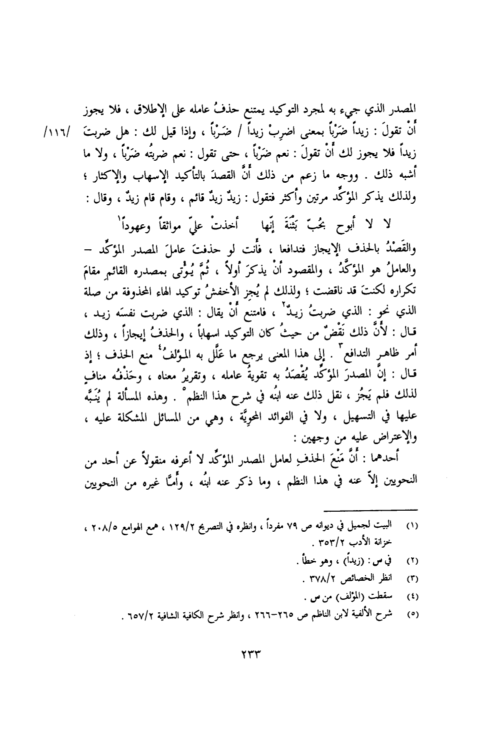 أحدهما: أنّ منع الحذف لعامل المصدر المؤكد لا أعرفه منقولًا عن أحد من النحويين إلّا عنه في هذا النظم، وما ذكر عنه ابنه، وأمَّا غيره من النحويين