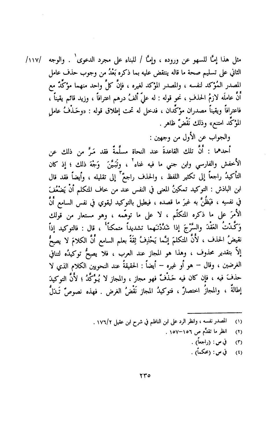 أحدهما: أن تلك القاعدة عند النحاة مسلّمة فقد مرّ من ذلك عن الأخفش والفارسي وابن جني ما فيه غناء، وتبيّن وجه ذلك؛ إذ كان التأكيد راجعًا إلى تكثير اللفظ، والحذف راجعٌ إلى تقليله، وأيضًا فقد قال ابن الباذش: التوكيد تمكين المعنى في النفس عند من خاف من المتكلم أن يضعف في نفسه، فيظن به غير ما قصده، فيطيل بالتوكيد ليقوي من نفس السامع أنّ الأمر على ما ذكره المتكلم، لا على ما توهمه، وهو مستعار من قولك وكَّدت العقد والسرج إذا شددتهما تشديدًا متمكنًا، قال فالتوكيد إذًا نقيض الحذف، لأن المتكلم إنما يحذف ثقة بعلم السامع أن الكلام لا يصِحُّ إلا بتقرير محذوف، وهذا هو المجاز عند العرب، فلا يصحُّ توكيده لتنافي الغرضين، وقال- هو أو غيره- أيضًا: الحقيقة عند النحويين الكلام الذي لا حذف فيه، فإن كان فيه حذف فهو مجاز، والمجاز لا يؤكد؛ لأن التوكيد إطالة، والمجاز اختصار، فتوكيد المجاز نقض الغرض. فهذه نصوص تدلُّ