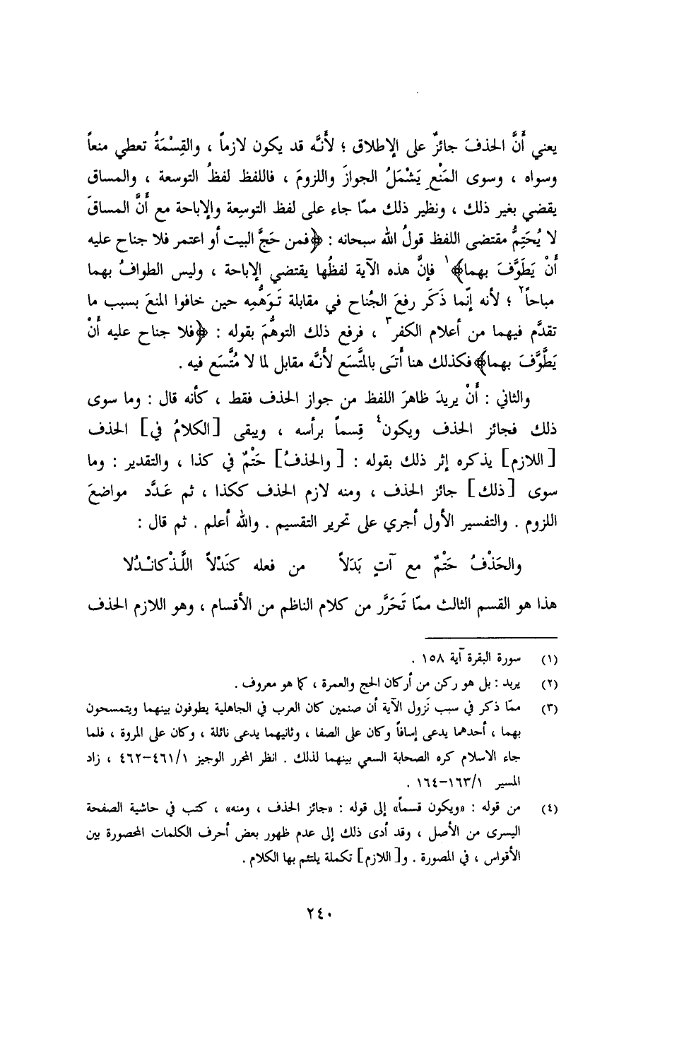 يعني أنّ الحذف جائز على الإطلاق؛ لأنه قد يكون لازمًا، والقسمة تعطي منعًا وسواه، وسوى المنع يشمل الجواز واللزوم، فاللفظ لفظ التوسعة، والمساق يقضي بغير ذلك، ونظير ذلك مما جاء على لفظ التوسعة والإباحة مع أن المساق لا يُحَتم مقتضى اللفظ قول الله سبحانه: {فمن حجَّ البيت أو اعتمر فلا جُناح عليه أن يَطَّوَف بهما} فإن هذه الآية لفظها يقتضي الإباحة، وليس الطواف بهما مباحًا؛ لأنه إنما ذكر رفع الجُناح في مقابلة توهُّمية حين خافوا المنع بسبب ما تقدّم فيهما من أعلام الكفر، فرفع ذلك التوهُّم بقوله: {فلا جُناح عليه أن يطوف بهما} فكذلك هنا أتى بالمتسع لأنه مقابل لما لا متسع فيه.