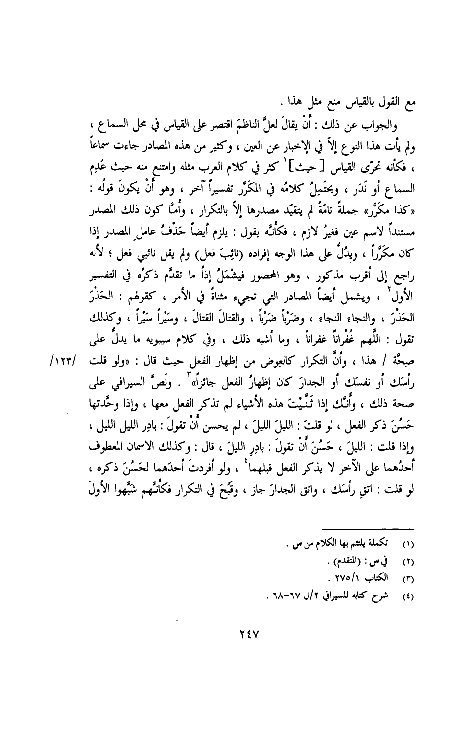 والجواب عن ذلك: أن يقال لعل الناظم اقتصر على القياس في محل السماع، ولم يأت هذا النوع إلا في الإخبار عن العين، وكثير من هذه المصادر جاءت سماعا، فكأنما تحرى القياس [حيث] كثر في كلام العرب مثله وامتنع منه حيث عدم السماع أو ندر، ويحتمل كلامه في المكرر تفسيرا آخر، وهو أن يكون قوله: "كذا مكرر" جملة تامة لم يتقيد مصدرها إلا بالتكرار، وأما كون ذلك المصدر مستندا لاسم عين فغير لازم، فكأنه يقول: يلزم أيضا حذف عامل المصدر إذا كان مكررا، ويدل على هذا الوجه إفراده (نائب فعل) ولم يقل نائبي فعل؛ لأنه راجع إلى أقرب مذكور، وهو المحصور فيشمل إذا ما تقدم ذكره في التفسير الأول، ويشمل أيضا المصادر التي تجيء مثناة في الأمر، كقولهم: الحذر الحذر، والنجاء النجاء، وضربا ضربا، والقتال القتال، وسيرا سيرا، وكذلك تقول: اللهم غفرانا غفرانا وما أشبه ذلك، وفي كلام سيبويه ما يدل على صحة هذا، وأن التكرار كالعوض من إظهار الفعل حيث قال: "ولو قلت رأسك أو نفسك أو الجدار كان إظهار الفعل جائزا". ونص السيرافي على صحة ذلك، وأنك إذا أثنيت هذه الأشياء لم تذكر الفعل معها، وإذا وحدتها حسن ذكر الفعل، لو قلت: الليل الليل، لم يحسن أن تقول: بادر الليل الليل، وإذا قلت: الليل، حسن أن تقول: بادر الليل، قال: وكذلك الاسمان المعطوف أحدهما على الآخر لا يذكر الفعل قبلهما، ولو أفردت أحدهما لحسن ذكره، لو قلت: اتق رأسك، واتق الجدار جاز، وقد قبح التكرار فكأنهم شبهوا الأول
