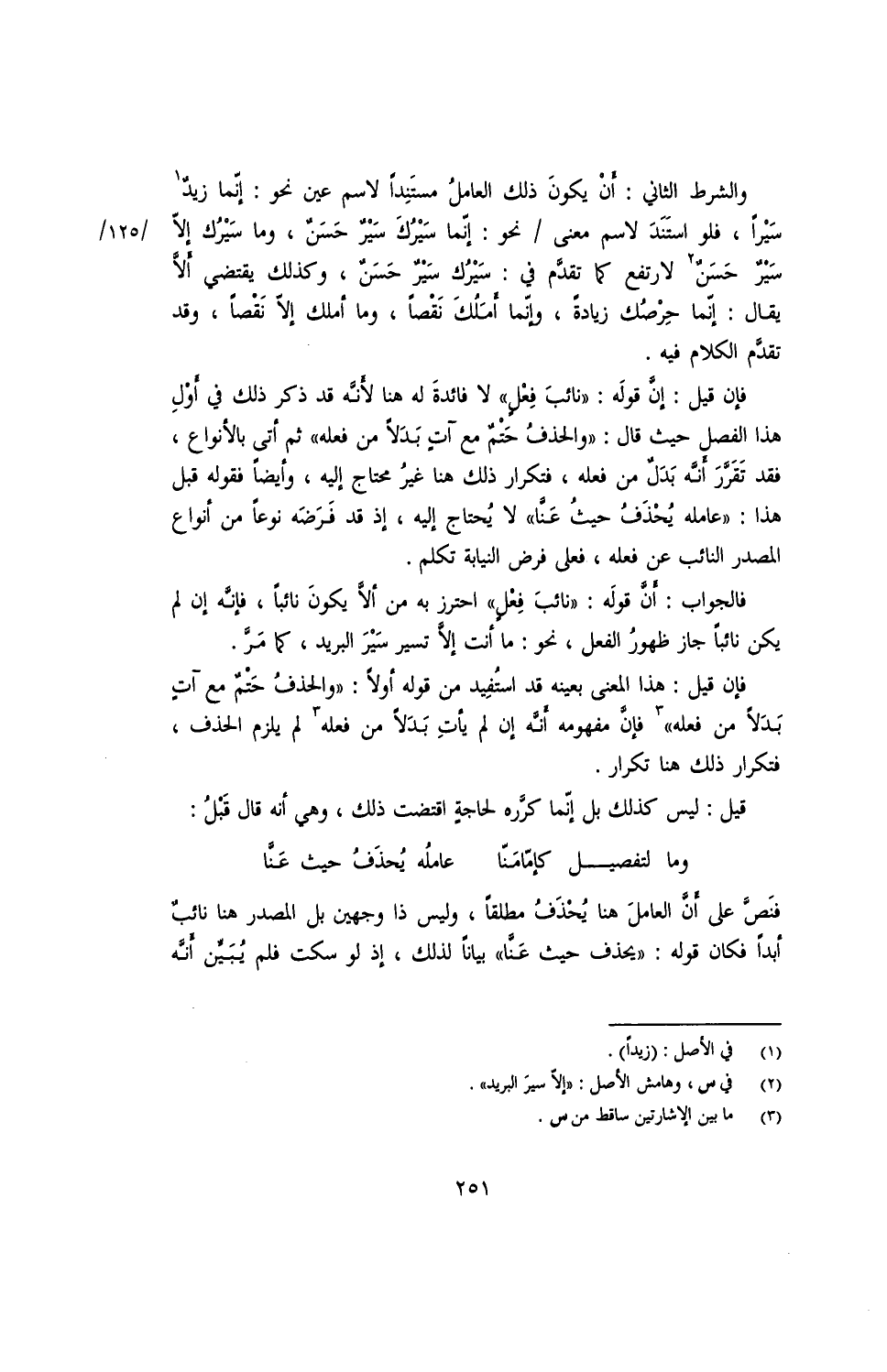 والشرط الثاني: أن يكون ذلك العامل مستندا لاسم عين نحو: إنما زيد سيرا، فلو استند لاسم معنى نحو: إنما سيرك سير حسن، وما سيرك إلا سير حسن لارتفع كما تقدم في: سيرك سير حسن، وكذلك يقتضي ألا يقال: إنما حرصك زيادة، وإنما أملك نقصا، وما أملك إلا نقصا، وقد تقدم الكلام فيه.