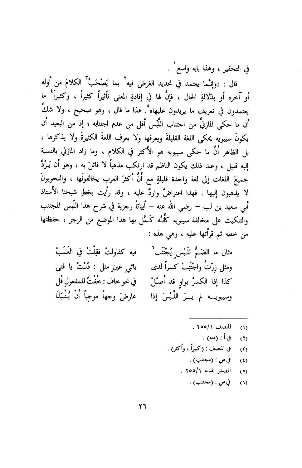 قال: ((وإنما يعتمد في تحديد الغرض فيه بما يصحب الكلام من أوله أو آخره أو بدلالة الحال, فإن لها في إفادة المعنى تأثيرًا كثيرًا, وكثيرًا ما يعتمدون في تعريف ما يريدون عليها)). هذا ماقال, وهو صحيح, ولا شك أن ما حكى المازني من اجتناب اللبس أقل من عدم اجتنابه؛ إذ من البعيد أن يكون سيبويه يحكى اللغة القليلة ويعرفها ولا يعرف اللغة الكثيرة ولا يذكرها, بل الظاهر أن ما حكى سيبويه هو الأكثر في الكلام, وما زاد المازني بالنسبة إليه قليل, وعند ذلك يكون الاظم قد ارتكب مذهبًا لا قاء لبه, وهو أن يرد جميع اللغات إلى لغة واحدة قليلة مع أن أكثر العرب يخالفونها, والنحويون لا يذهبون إليها. فهذا اعتراض واردٌ عليه, وقد رأيت بخط شيخنا الأستاذ أبي سعيد بن لب-رضي الله عنه- أبياتًا رجزية في شرح هذا اللبس المجتنب والتنكيت على مخالفة سيبويه كأنه كمّل بها هذا الموضع من الرجز, حفظتها من خطه ثم قرأتها عليه, وهي هذه: