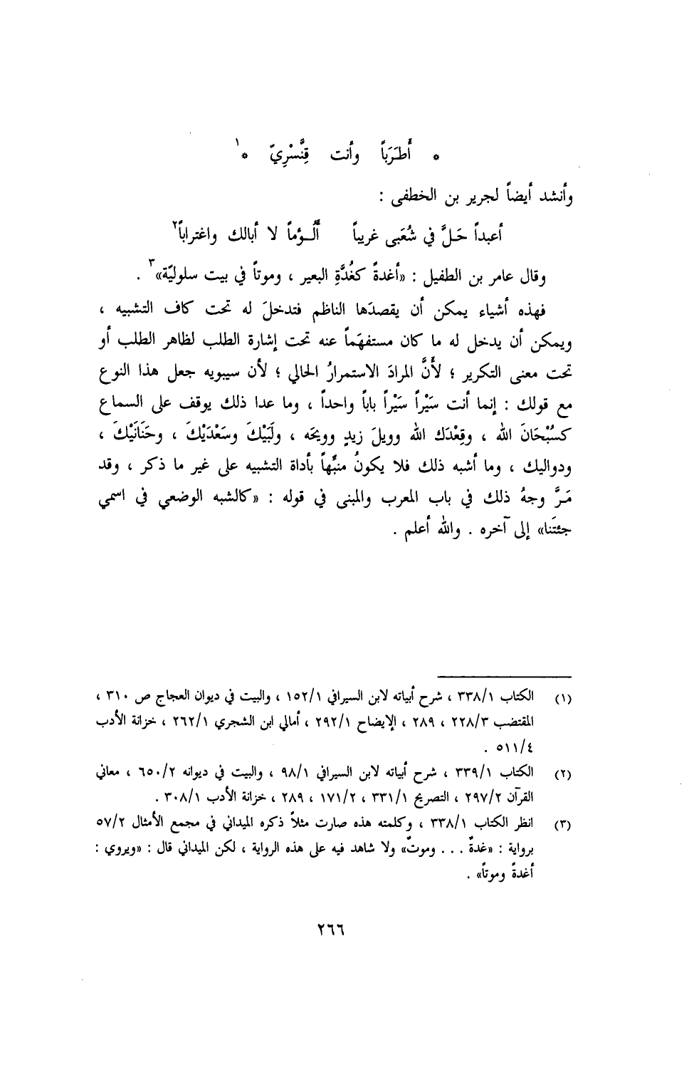 فهذه أشياء يمكن أن يقصدها الناظم فتدخل له تحت كاف التشبيه، ويمكن أن يدخل له ما كان مستفهما عنه تحت إشارة الطلب لظاهر الطلب أو تحت معنى التكرير؛ لأنه المراد الاستمرار الحالي؛ لأن سيبويه جعل هذا النوع مع قولك: إنما أنت سيرا سيرا بابا واحدا، وما عدا ذلك يوقف على السماع كسبحان الله، وقعدك الله وويل زيد وويحه، ولبيك وسعديك، وحنانيك، ودواليك، وما أشبه ذلك فلا يكون منبها بأداة التشبيه على غير ما ذكر، وقد مرَّ وجه ذلك في باب المعرب والمبني في قوله: "كالشبه الوضعي في اسمي جئتنا" إلى آخره. والله أعلم.