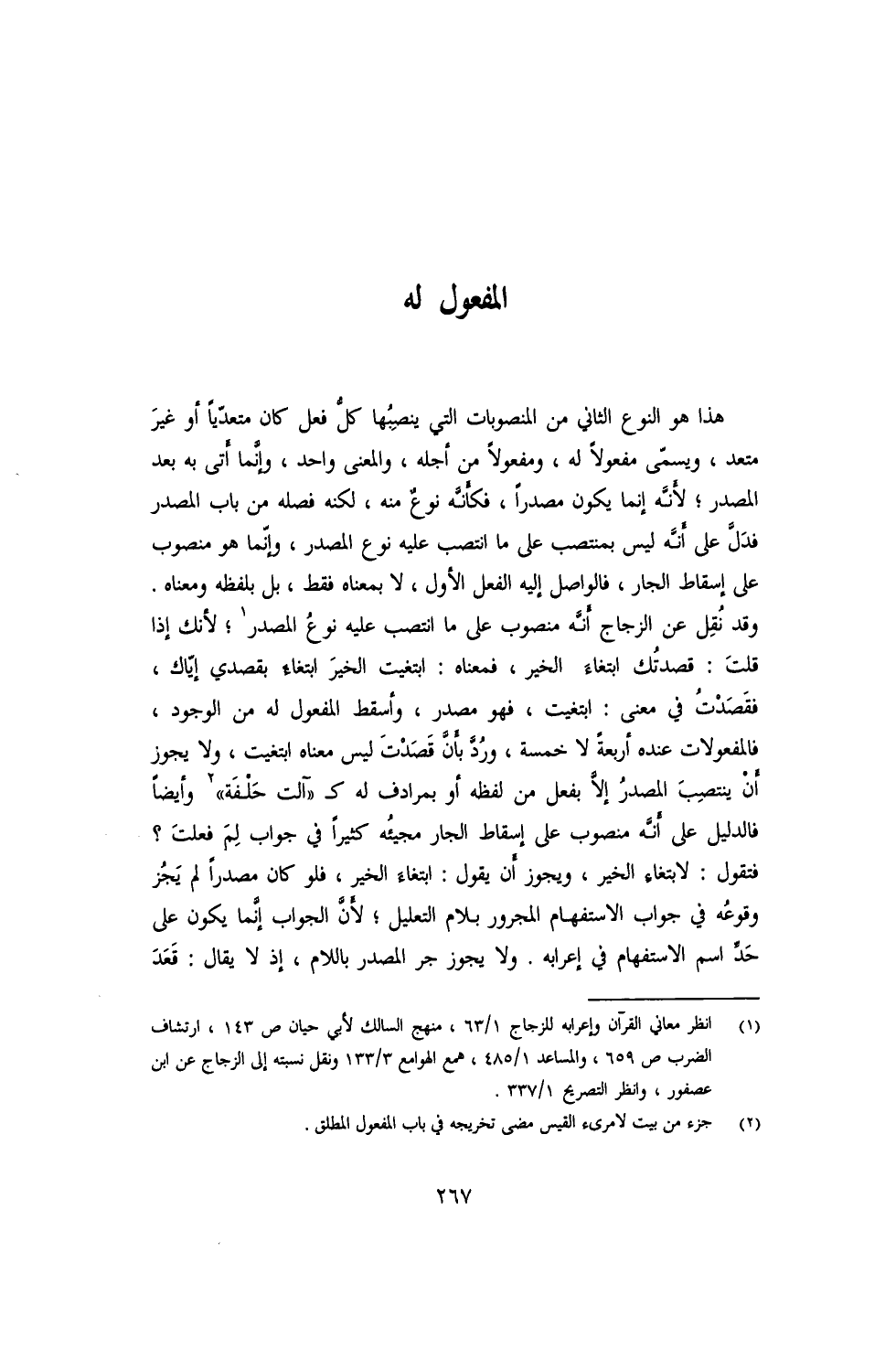 وقد نُقِل عن الزجاج أنه منصوب على ما انتصب عليه نوع المصدر؛ لأنك إذا قلت: قصدتك ابتغاء الخير، فمعناه: ابتغيت الخير ابتغاء بقصدي إياك، فقصدت في معنى: ابتغيت، فهو مصدر، وأسقط المفعول له من الوجود، فالمفعولات عنده أربعة لا خمسة، ورد بأن قصدت ليس معناه ابتغيت، ولا يجوز أن ينتصب المصدر إلا بفعل من لفظه أو بمرادف له كـ"آلت حلفه" وأيضا فالدليل على أنه منصوب على إسقاط الجار مجيئه كثيرا في جواب لم فعلت؟ فتقول: لابتغاء الخير، ويجوز أن يقول: ابتغاء الخير، فلو كان مصدرا لم يجز وقوعه في جواب الاستفهام المجرور بلام التعليل؛ لأن الجواب إنما يكون على حد اسم الاستفهام في إعرابه. ولا يجوز جر المصدر باللام، إذ لا يقال: قعد