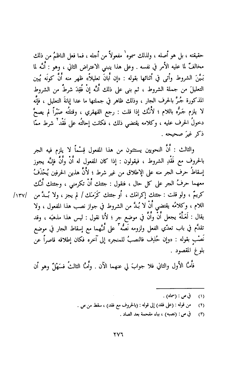 والثالث: أنَّ النحويين يستثنون من هذا المفعول قِسمًا لا يلزم فيه الجر بالحروف مع فقد الشروط، فيقولون: إذا كان المفعول له أنْ وأنَّ فإنّه يجوز إسقاط حرف الجر منه على الإطلاق من غير شرط؛ لأنَّ هذين الحرفين يُحذَفُ معهما حرفُ الجر على كل حال، فتقول: جئتك أن تكرمني، وجئتك أنَّك كريم، ولو قلت: جئتك إكرامك، أو جئتك كرمَك لم يجز، ولا بد من اللام، وكلامه يقتضي أن لا بد من الشروط في جواز نصب هذه المفعول، ولا يقال: لعله يجعل أنْ وأنَّ في موضع جر؛ لأنا نقول: ليس هذا مذهبه، وقد تقدّم في باب تعدّي الفعل ولزومه نَصُّه على أنّهما مع إسقاط الجار في موضع نصْبٍ بقوله: "وإن حُذف فالنصبُ للمنجر" إلى آخره فكان إطلاقه قاصرًا عن بلوغ المقصود.