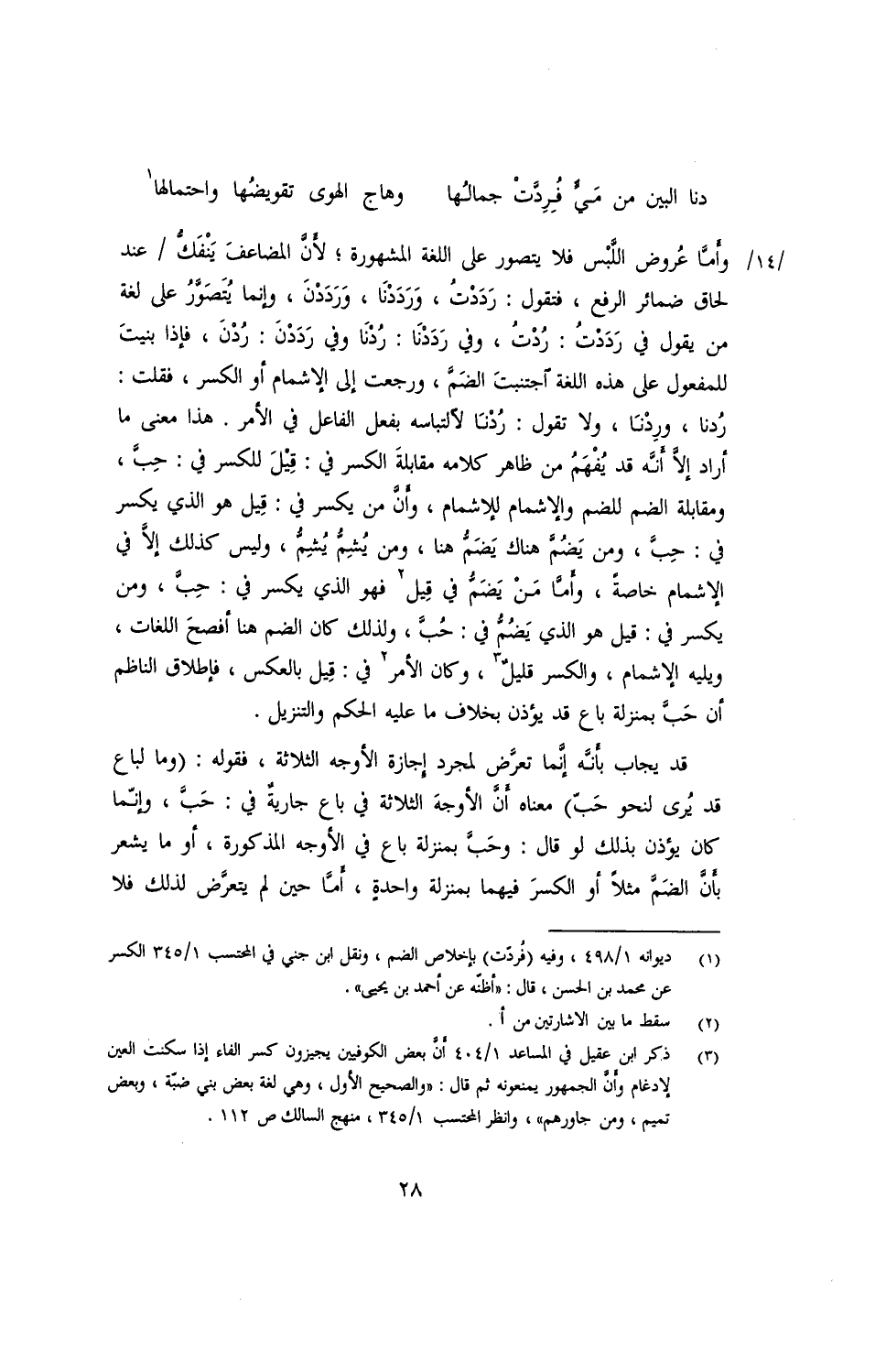 وأما عروض اللبس فلا يتصور اللغة المشهور؛ لأن المضاعف ينفك عند لحاق ضمائر الرفع, فتقول: رددت, ورددنا, ورددن, وإنما يتصور على لغة من يقول في رددتُ: وفي رددنا, رُدْنا وفي رددن: رُدْن, فإذا بنيت للمفعول على هذه اللغة اجتنبت الضم, ورجعت إلى الإشمام أو الكسر, فقلت: رُدنا, ورِدنا, ولا تقول: رُدنا لالتباسه بفعل الفاعل في الأمر. هذا معنى ما أراد إلا أنه قد يفهم من ظاهر كلامه مقابلة الكسر في: قيل للكسر في: حِبَّ, ومقابلة الضم للضم والإشمام للإشمام, وأن من يكسر في: قيل فهو الذي يكسر في حِبَّ, ومن يضم هناك يضم هنا, ومن يشم يشم, وليس كذلك إلا في الإشمام خاصة, وأما من يضم في قيل, فهو الذي يكسر في: حِبَّ ومن يكسر في: قيل هو الذي يضم في: حُبَّ, ولذلك كان الضم هنا أفصح اللغات, ويليه الإشمام والكسر قليل, وكان الأمر في: قيل بالعكس, فاطلاق الناظم أن حَبَّ بمنزلة باع قد يؤذن بخلاف ما عليه الحكم والتنزيل.