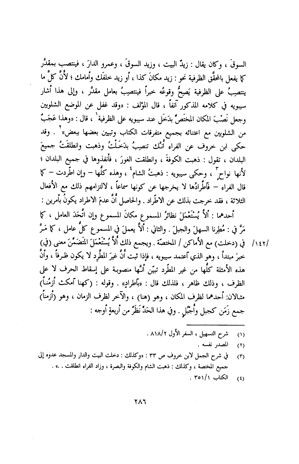 أحدهما: ألا يُستعمَل نظائر المسموع مكان المسموع وإن اتّحد العامل، كما مرّ في: مُطرنا السهل والجبل. والثاني: ألّا يعمل في المسموع كل عامل، كما مرّ في (دخلت) مع الأماكن المختصّة. ويجمع ذلك ألا يُستعمَل المتضمِّن معني (في) خبر مبتدأ، وهو الذي اعتمد سيبويه، فإذا ثبت أنّ غير المطَّرِد لا يكون ظرفًا، وأنّ هذه الأمثلة كلّها من غير المطّرد تبيّن أنّها منصوبة على إسقاط الحرف لا على الظرف، وذلك ظاهر، فلذلك قال: "باطراد". وقوله: (كهنا امكث أزمنًا) مثالان: أحدهما لظرف المكان، وهو (هنا)، والآخر لظرف الزمان، وهو (أزمنًا) جمع زمن كجبل وأجبُل. وفي هذا الحدِّ نظرٌ من أربعة أوجه: