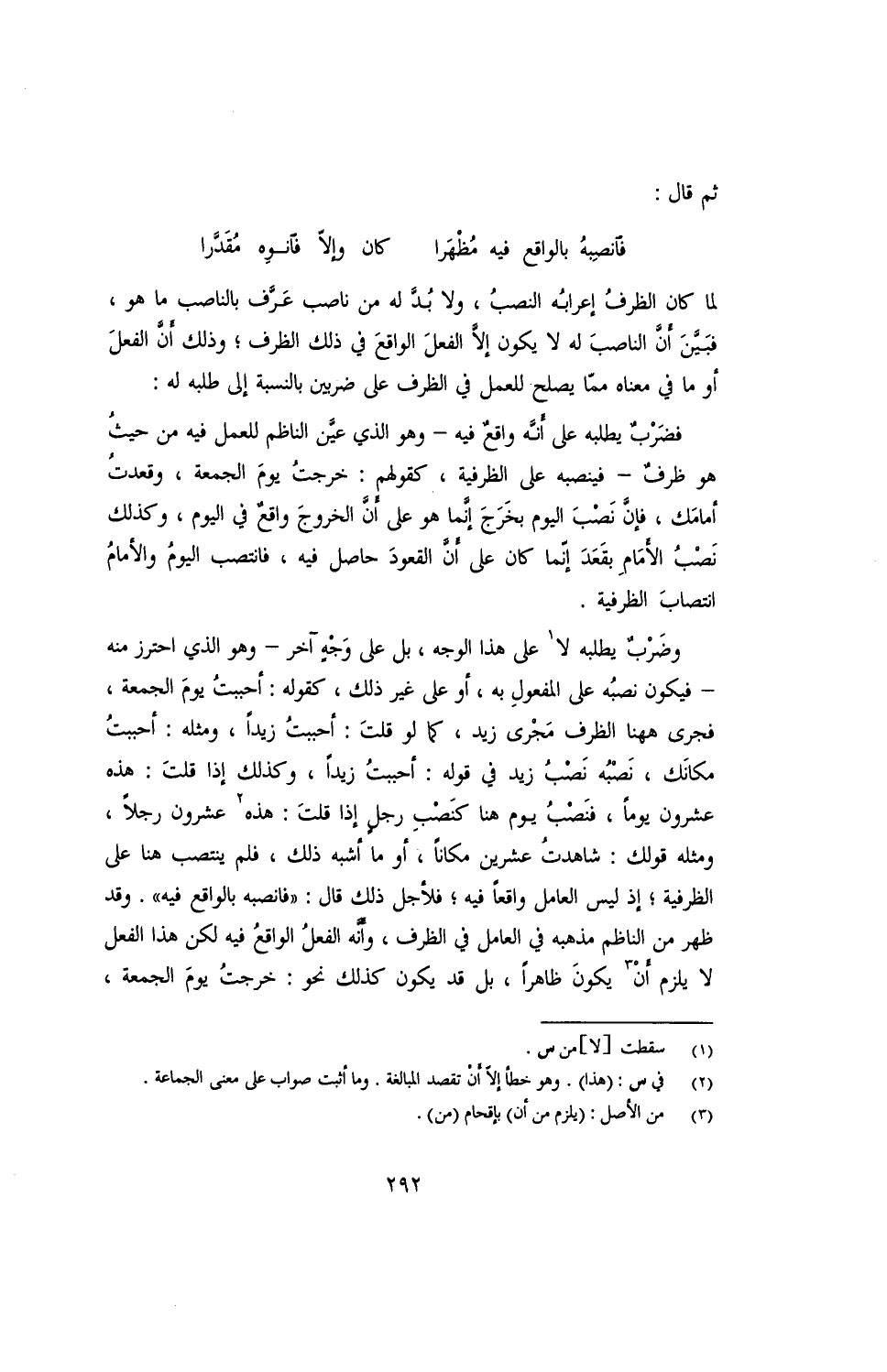 وضربٌ يطلبه لا على هذا الوجه، بل على وجهٍ آخر -وهو الذي احترز منه- فيكون نصبُه على المفعول به، أو على غير ذلك، كقوله: أحببت يومَ الجمع، فجرى ههنا الظرف مجرى زيد، كما لو قلتَ: أحببتُ زيدًا، ومثله: أحببتُ مكانَك، نصبه نصب زيد في قوله: أحببتُ زيدًا، وكذلك إذا قلتَ: هذه عشرون يومًا، فنَصْبُ يوم هنا كنصب رجل إذا قلت: هذه عشرون رجلًا، ومثله قولك: شاهدت عشرين مكانًا، أو ما أشبه ذلك، فلم ينتصب هنا على الظرفية؛ إذ ليس العامل واقعًا فيه؛ فلأجل ذلك قال: "فانصبه بالواقع فيه". قد ظهر من الناظم مذهبه في العامل في الظرف، وأنه الفعل الواقع فيه لكن هذا الفعل لا يلزم أن يكون ظاهرًا، بل قد يكون كذلك نحو: خرجتُ يومَ الجمعة،