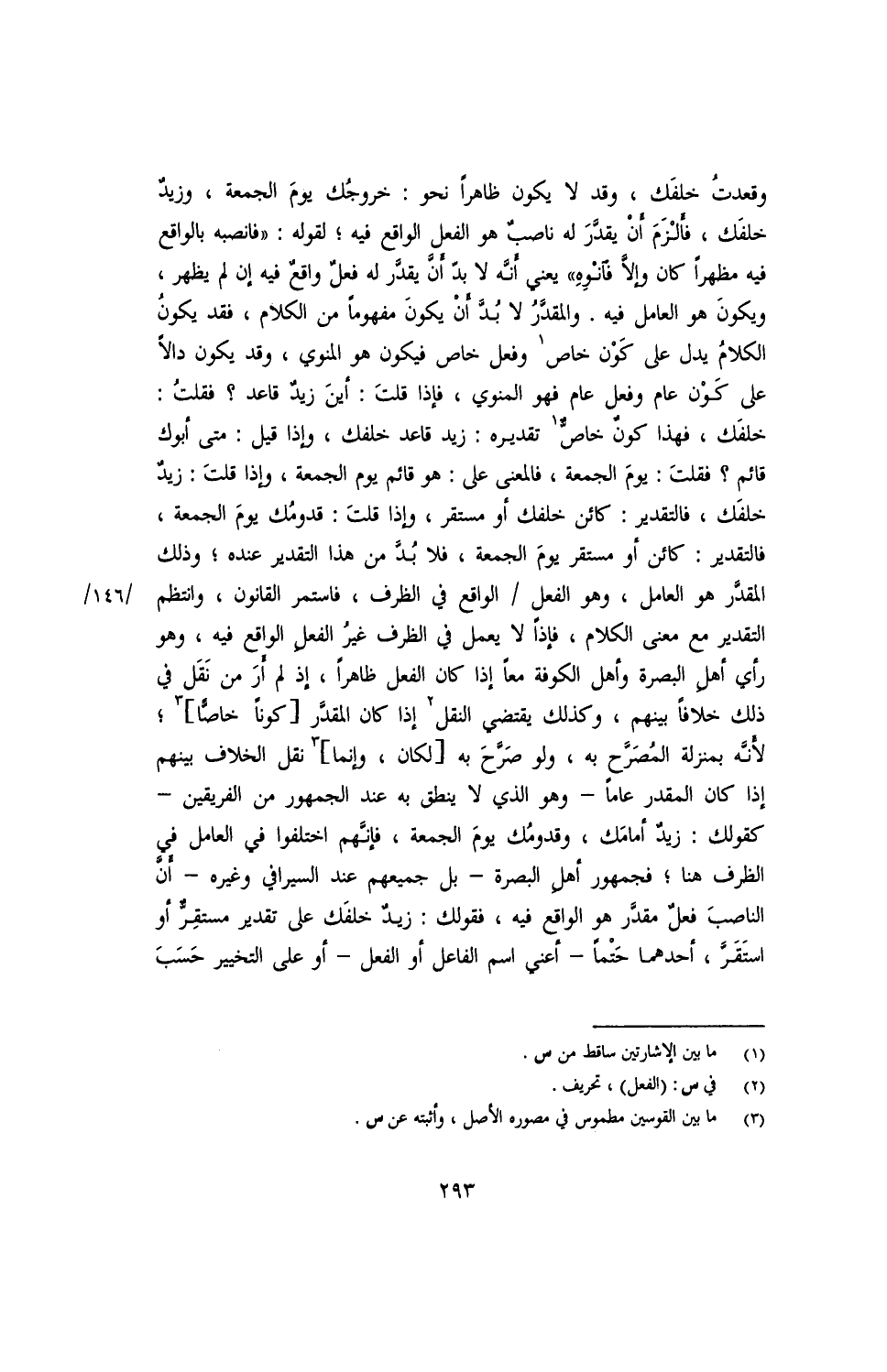وقعدتُ خلفك، وقد لا يكون ظاهرًا نحو: خروجك يوم الجمعة، وزيدٌ خلفك، فألزَمَ أن يقدَّر له ناصبٌ هو الفعل الواقع فيه؛ لقوله: "فانصبه بالواقع فيه مظهرًا كان وإلا فانوِهِ" يعني أنه لا بد أن يقدر له فعل واقع فيه إن لم يظهر، ويكون هو العامل فيه. والمقدّر لا بد أن يكون مفهومًا من الكلام، فقد يكون الكلام يدل على كون خاص وفعال خاص فيكون هو المنوي، وقد يكون دالًا على كون عام وفعل عام فهو المنوي، فإذا قلت: أين زيدٌ قاعد؟ فقلت: خلفك، فهذا كونٌ خاصٌ تقديره: زيد قاعد خلفك، وإذا قيل: متى أبوك قائم؟ فقلتَ: يومَ الجمعة، فالمعنى على: هو قائم يوم الجمعة، وإذا قلتَ زيدٌ خلفك، فالتقدير: كائن خلفك أو مستقر، وإذا قلت: قدومك يومَ الجمعة، فالتقدير: كائن أو مستقر يوم الجمعة، فلا بد من هذا التقدير عنده؛ وذلك المقدّر هو العامل، وهو الفعل الواقع في الظرف، فاستمر القانون، وانتظم التقدير مع معنى الكلام، فإذا لا يعمل في الظرف غير الفعل الواقع فيه، وهو رأي أهل البصرة وأهل الكوفة معًا إذا كان الفعل ظاهرًا، إذا لم أرَ من نقل في ذلك خلافًا بينهم، وكذلك يقتضي النقل إذا كان المقدَّر [كونًا خاصًا]؛ لأنه بمنزلة المُصرَّح به، ولو صرَّح به [لكان، وإنما] نقل الخلاف بينهم إذا كان المقدر عامًا -وهو الذي لا ينطق به عند الجمهور من الفريقين -كقولك: زيدٌ أمامك، وقدومك يوم الجمعة، فإنهم اختلفوا في العامل في الظرف هنا؛ فجمهور أهل البصرة- بل جمعيهم عند السيرافي وغيره- أنّ الناصب فعلٌ مقدّر هو الواقع فيه، فقولك زيدٌ خلفك على تقدير مستقر أو استقر، أحدهما حتمًا -أعني اسم الفاعل أو الفعل- أو على التخيير حسب