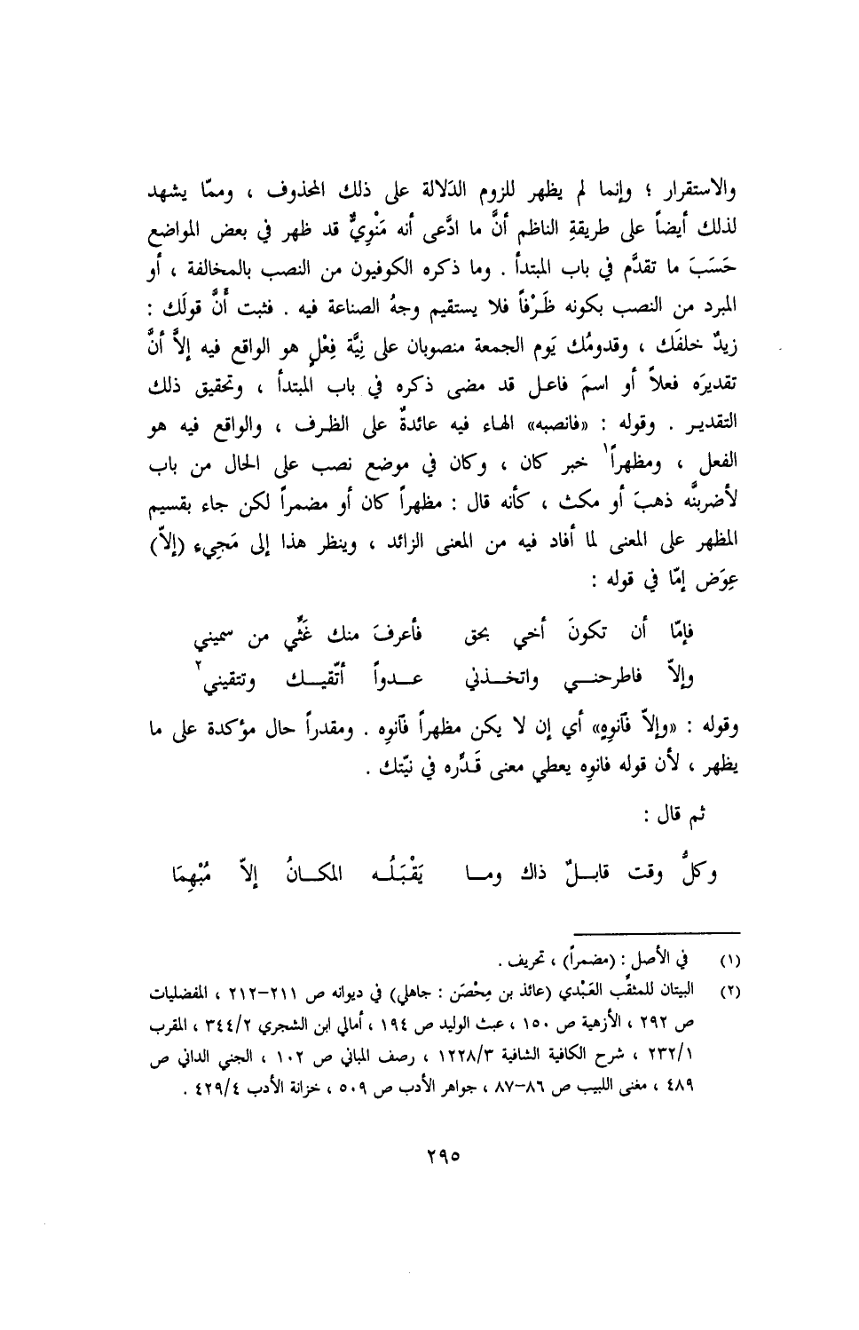 والاستقرار؛ وإنما لم يظهر للزوم الدلالة على ذلك المحذوف، ومما يشهد لذلك أيضًا على طريقة الناظم أن ما ادّعى أن مَنْوِيٌّ قد ظهر في بعض المواضع حسب ما تقدّم في باب المبتدأ. وما ذكره الكوفيون من النصب بالمخالفة، أو المبرد من النصب بكونه ظرفًا فلا يستقيم وجه الصناعة فيه. فثبت أنّ قولك: زيدٌ خلفك، وقدومك يوم الجمعة منصوبان على نيّة فعلٍ هو الواقع فيه إلّا أنّ تقديره فعلًا أو اسم فاعل قد مضى ذكره في باب المبتدأ، وتحقيق ذلك التقدير. وقوله: "فانصبه" الهاء فيه عائدة على الظرف، والواقع فيه هو الفعل، ومظهرًا خبر كان، وكان في موضع نصب على الحال من باب لأضربنّه ذهب أو مكث، كأنه قال: مظهرًا كان أو مضمرًا لكن جاء بقسيم المظهر على المعنى لما أفاد فيه من المعنى الزائد، وينظر هذا إلى مجيء (إلّا) عِوَض إمّا في قوله: