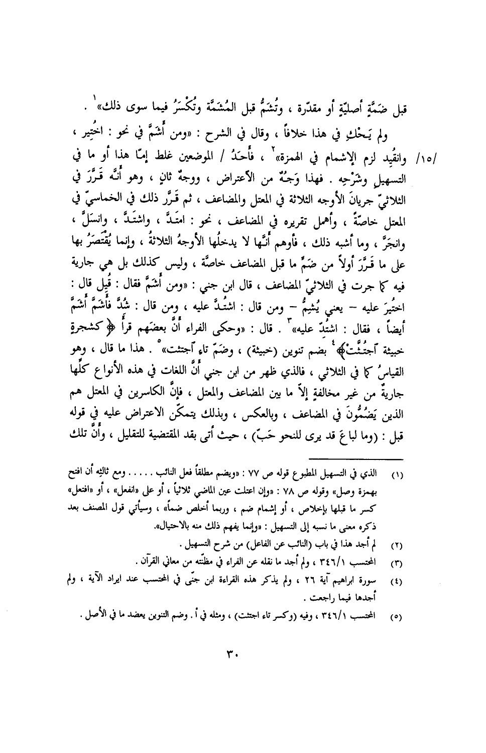ولم يحك في هذا خلافًا, وقال في الشرح: ((ومن أشم نحو: اخُتير, وانُقيد لزم الإشمام في الهمزة)) , فأحد/ الموضعين غلط إما هذا أو ما في التسهيل وشرحِه. فهذا وجه من الاعتراض, ووجه ثانٍ, وهو أنه قرر في الثلاثي جريان الأوجه الثلاثة في المعتل والمضاعف, ثم قرر ذلك في الخماسي في المعتل خاصة, وأهمل تقريره في المضاعف, نحو: امتدَّ, واشتدَّ, وانسلَّ, وانجرَّ, وما أشبه ذلك, فأوهم أنها لا يدخلها الأوجه الثلاثة, وإنما يقتصر بها على ما قرر أولًأ من ضم ما قبل المضاعف خاصة, وليس كذلك بل هي جارية فيه كما جرت في الثلاثي المضاعف, قال ابن جني: ((ومن أشم فقال: قُيِل قال: اختير عليه- يعني يُشم- ومن قال: اشتُدّ عليه, ومن قال: شُدَّ فأشمَّ أشمَّ أيضًا, فقال: اشتد عليه)). قال: ((وحكى الفراء أن بعضهم قرأ {كشجرةٍ خبيثة اجتُثَّتْ} , بضم تنوين (خبيثة) وضم تاء اجتثت)). هذا ما قال, وهو القياس كما في الثلاثي, فالذي ظهر من ابن جني أن اللغات في هذه الأنواع كلها جارية من غير مخالفة إلا ما بين المضاعف والمعتل, فإن الكاسرين في المعتل هم الذين يضمون في المضاعف, وبالعكس, وبذلك يتمكن الاعتراض عليه في قوله قبل: (وما لباع قد يرى حَبّ) حيث أتى المقتضية للتقليل, وأن تلك