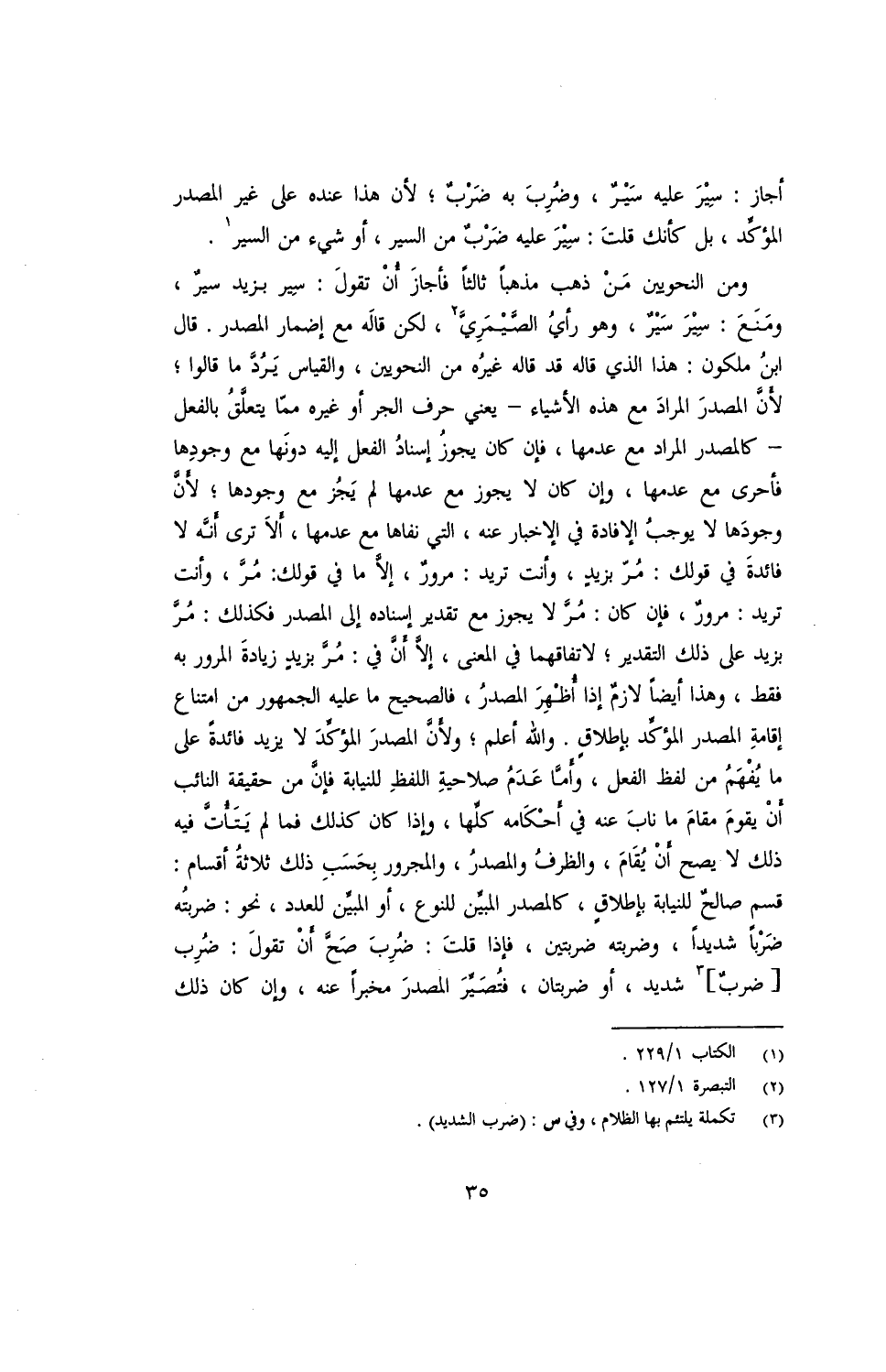 ومن النحويين من ذهب مذهبًا ثالثًا فأجاز ان تقول: سِيرَ بزيد سيرٌ, ومنع: سِيرَ سيْرٌ , وهو رأي الصَّيْمَرِي, لكن قاله مع إضمار المصدر. قال ابن ملكون: هذا الذي قاله قد قاله غيرُه من النحويين, والقياس يَرُدّ مالقالوا؛ لان المصدر المراد مع هذه الأشياء -يعني حرف الجر أو غيره مما يتعلق بالفعل- كالمصدر المراد مع عدمها, فإن كان يجوز إسناد الفعل إليه دونها مع وجودها فأحرى مع عدمها, وإن كان لا يجوز مع عدمها لم يجز مع وجودها؛ لأن وجودها لا يوجب الغفادة في الإخبار عنه, التي نفاها مع عدمها, ألا ترى أنه لا فائدة في قولك: مُرّ بزيدٍ, وأنت تريد: مرورٌ, إلا أن ما في قولك: مُرَّ, وأنت تريد: مرورٌ, فإن كان: مُرَّ لا يجوز مع تقدير إسناده إلى المصدر فكذلك: مُرَّ يزيد على ذلك التقدير؛ لاتفاقهما في المعنى, إلا أن في: مُرَّ بزيدٍ زيادة المرور به فقط, وهذا أيضًا لازمٌ إذا أُظهر المصدرُ, فالصحيح ما عليه الجمهور من امتناع إقامة المصدر المؤكد بإطلاق. والله أعلم؛ ولأن المصدر المؤكد لا يزيد فائدةً على ما يفهم من لفظ الفعل, وأما عدم صلاحية اللفظ للنيابة فإن من حقيقة النائب أن يقوم مقام ما ناب عنه في أحكامه كلها, وإذا كان كذلك فما لم يتأت فيه ذلك لا يصح أن يقام, والظرف والمصدر, والمجرور بحسب ذلك ثلاثة أقسام: قسم صالحٌ للنيابة بإطلاق, كالمصدر المبين للنوع, أو المبين للعدد, نحو: ضربتُه ضربًا شديدًا, وضربته ضربتين, فإذا قلتَ: ضُرِبَ صَحَّ أن تقول: ضُرِبَ [ضربٌ] شديد, أو ضربتان, فتُصَيِّرَ المصدرَ مخبرًا عنه, وإن كان ذلك