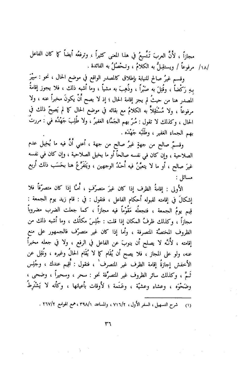الأولى: إقامة الظرف إذا كان غير متصرف, أما إذا كان متصرفًا فلا إشكال في إقامته لقبوله أحكام الفاعل, فتقول: في: قام زيد يوم الجمعة: قِيم يومُ الجمعة, فتجعله مَقُومًا فيه مجازًا, وكذلك ظرف المكان إذا قلت: جُلِسَ مكانُك, وما أشبه ذلك من الظروف المختصة المتصرفة, وأما إذا كان غير متصرف فالجمهور على منع إقامته, لأنه لا يصلح أن ينوب عن الفاعل في الرفع, ولا في جعله مخبرًا عنه, ولو على المجاز, فلا يصح أن يقام كما لا يقام الحال وغيره, ونقل عن الأخفش إجازة إقامة الظرف غير المتصرف, فتقول: أُقِيم عنك, وجُلِسَ ثَمَّ, وكذلك سائر الظروف غير المتصرفة نحو: سحر, وسحيرًا, وضحى, وضَحْوَه, وعشاء وعشيّة, وعَتَمة؛ لأوقات بأعيانها, وكأنه لا يشترط