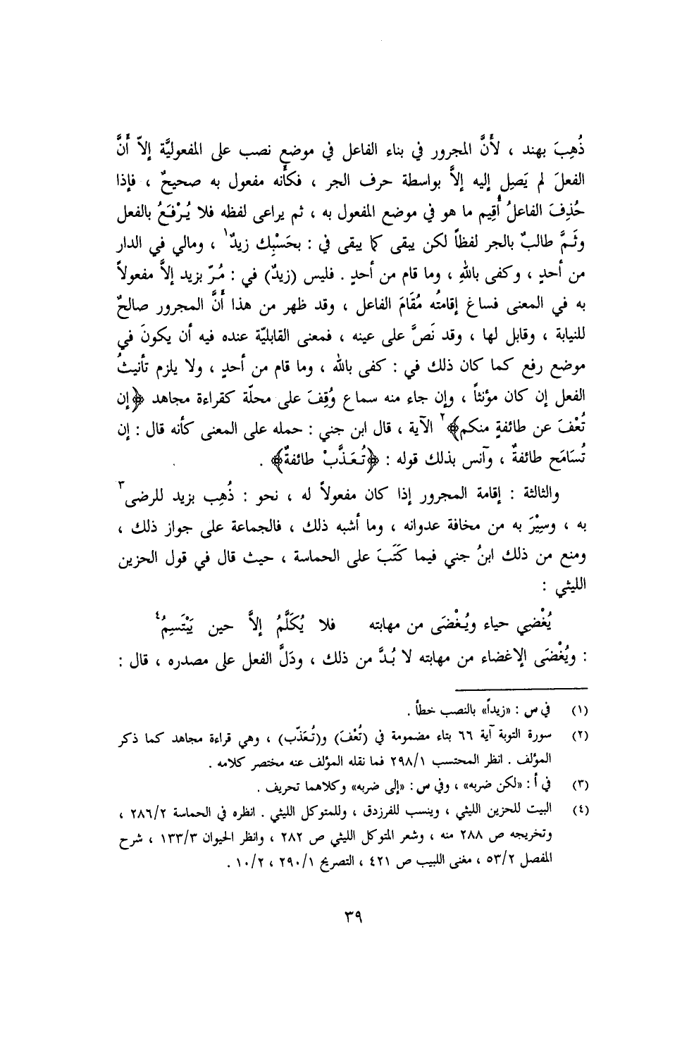 ذُهِبَ بهند, لأنّ المجرور في بناء الفاعل في موضع نصب على المفعوليّة إلا أنّ الفعلَ لم يصل إليه بواسطة حرف الجر, فكأنه مفعول به صحيحٌ, فإذا حُذِفَ الفاعلُ أقيم ما هو في موضع المفعول به, ثم يراعى لفظه فلا يرفع بالفعل وثمَّ طالبٌ بالجر لفظًا لكن يبقى كما يبقى في: بحسْك زيدٌ, ومالي في الدار من أحدٍ, وكفى بالله, وما قام من أحدٍ. فليس (زيدٌ) في: مُرّ بزيد إلا مفعولًا به في المعنى فساغ إقامتُه مقامَ الفاعل, وقد ظهر من هذا أن المجرور صالحٌ للنيابة, وقابل لها, وقد نصّ عليه عينه, فمعنى القابليّة عنده فيه أن يكون في موضع رفع كما كان ذلك في: كفى الله, وما قام من أحدٍ, ولا يلزم تأنيثُ الفعل إن كان مؤنثًا, وإن جاء منه سماع وُقِفَ على محلة كقراءة مجاهد {إن تُعْفَ عن طائفةٍ منكم} الآية, قال ابن جني: حمله على المعنى كأنه قال: إن تُسامَح طائفةٌ, وآنس بذلك قوله: {تُعَذِّب طائفةٌ}.