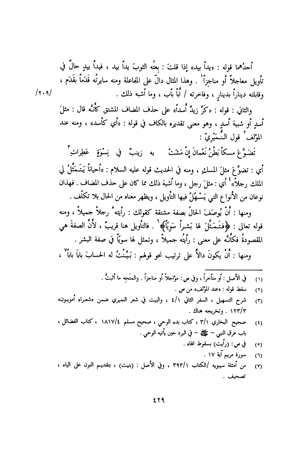 ومنها: أن يوصف الحال بصفة مشتقة كقولك: رأيته رجلًا جميلًا، ومنه قوله تعالى: {فتمثل له بشرًا سويًا}. فالتأويل هنا قريب، لأن الصفة هي المقصودة فكأنه على معنى: رأيته جميلًا، وتمثل لها سويًا في صفة البشر.