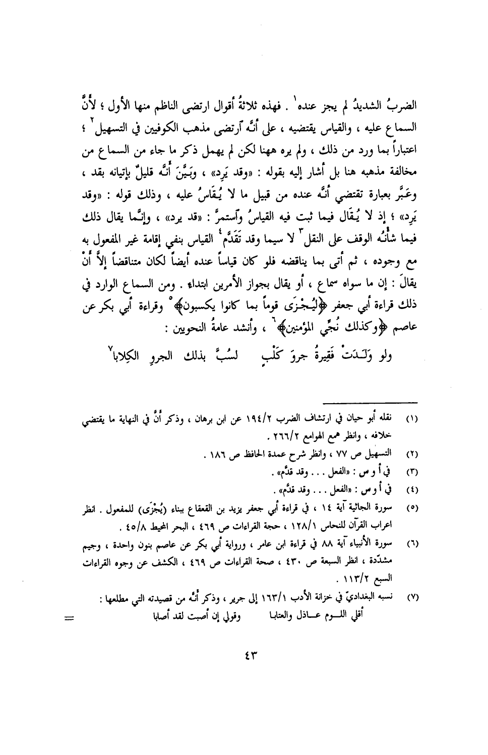 الضربُ الشديدُ لم يجز عنده. فهذه ثلالثة أقوال ارتضى الناظم منها الأول؛ لأنّ السماع عليه, والقياس يقتضيه, على أنه ارتضى مذهب الكوفيين في التسهيل؛ اعتبارًا بما ورد من ذلك, ولم يره ههنا لكن لم يهمل ذكر ما جاء من السماع من مخالفة مذهبه هنا بل أشار إليه بقوله: ((وقد يَرِد)) وبيّن أنّه عنده من قبيل ما لا يقاسُ عليه, وذلك قوله: ((وقد يَرِد))؛ إذ لا يُقال فيما ثبت فيه القياس واستمرّ: ((قد يرد)) وإنّما يقال ذلك فيما شأنه الوقف على النقل لاسيما وقد تقدّم القياس بنفي إقامة غير المفعول به مع وجوده, ثم أتى بما يناقضه فلو كان قياسًا عنده أيضًا لكان متناقضًا إلّا أنْ يقالَ: إن ما سواه سماع, أو يقال بجواز الأمرين ابتداءً. ومن السماع الوارد في ذلك قراءة أبي جعفر {ليُجزَى قومًا بما كانوا يكسبون} وقراءة أبي بكر عن عاصم {وكذلك نُجِّي المؤمنين} , وأنشد عامة النحويين: