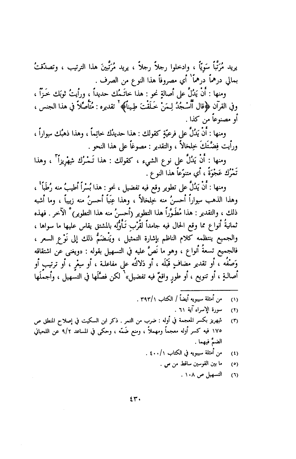 ومنها: أن يدل على تطوير وقع فيه تفضيل، نحو: هذا بسرًا أطيب منه رطبًا، وهذا الذهب سوارًا أحسن منه خلخالًا، وهذا عنبًا أحسن منه زبيبًا، وما أشبه ذلك، والتقدير: هذا مطورًا هذا التطوير (أحسن منه هذا التطوير) الآخر. فهذه ثمانية أنواع مما وقع الحال فيه جامدًا لقرب تأوله بالمشتق يقاس عليها ما سواها، والجميع ينتظمه كلام الناظم بإشارة التمثيل، وينضم ذلك إلى نوع السعر، فالجميع تسعة أنواع، وهو ما نص عليه في التسهيل بقوله: "ويغنى عن اشتقاقه وصفه، أو تقدير مضاف قبله، أو دلالته على مفاعلة، أو سعرٍ، أو ترتيب أو أصالةٍ، أو تنويع، أو طورٍ واقعٌ فيه تفضيل" لكن فصلها في التسهيل، وأجملها