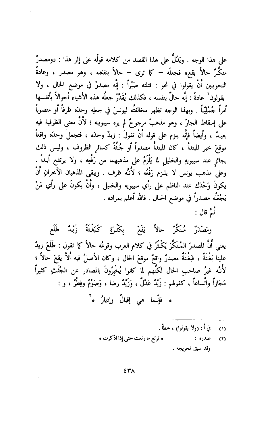 يعني أن المصدر المنكر يكثر في كلام العرب وقوعه حالًا كما تقول: طلع زيدٌ علينا بغتةً، فبغتةٌ مصدرٌ واقعٌ موقع الحال، وكان الأصل فيه ألا يقع حالًا؛ لأنه غير صاحب الحال لكنهم لما كانوا يخبرون بالمصادر عن الجثث كثيرًا مجازًا واتساعًا، كقولهم: زيدٌ عدلٌ، وزيدٌ رضا، وصومٌ وفطرٌ، و: