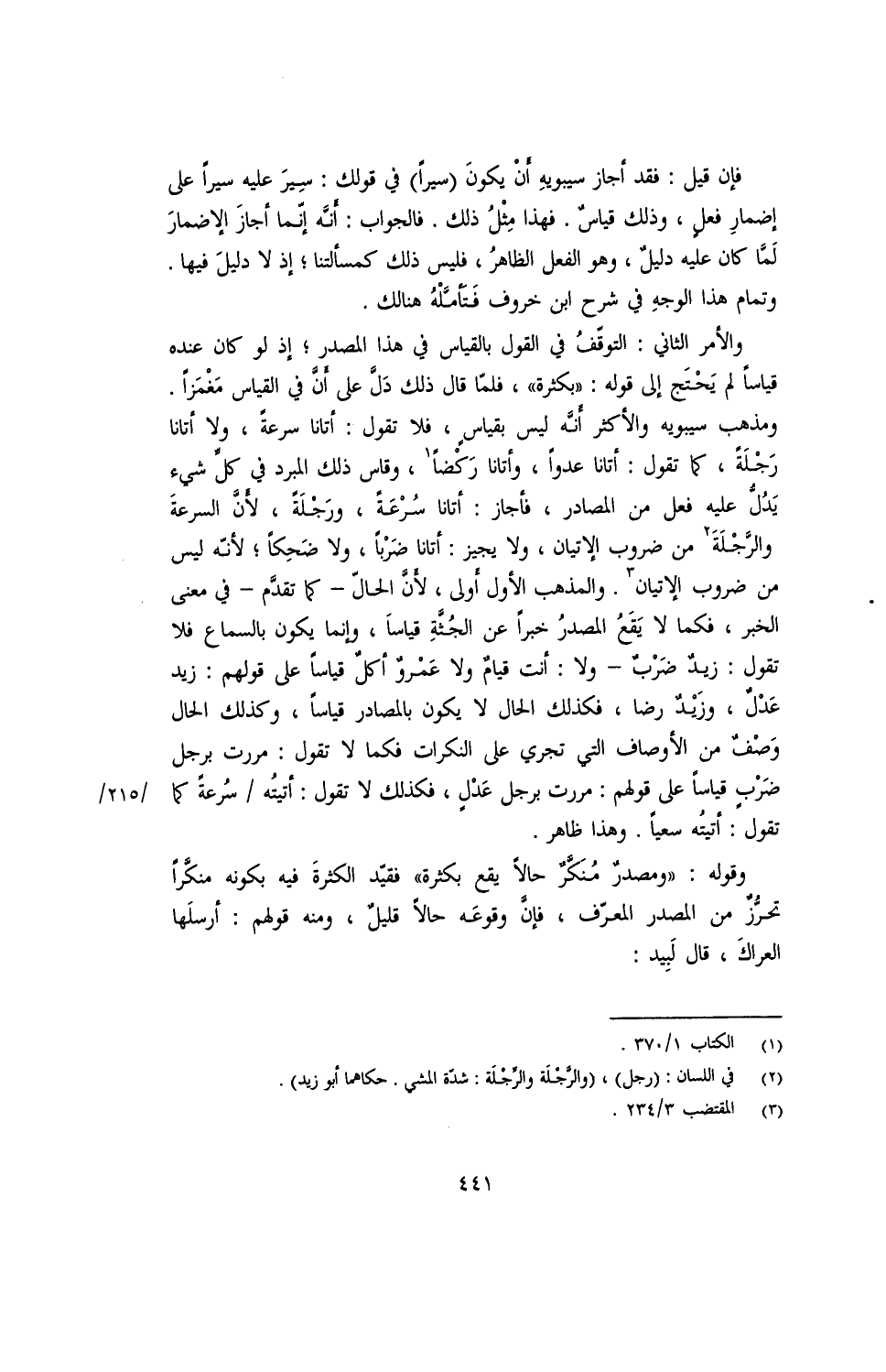 والأمر الثاني: التوقف في القول بالقياس في هذا المصدر؛ إذ لو كان عنده قياسًا لم يحتج إلى قوله: "بكثرة"، فلما قال ذلك دل على أن في القياس مغمزًا. ومذهب سيبويه والأكثر أنه ليس بقياس، فلا تقول: أتانا سرعةً، ولا أتانا رجلةً، كم تقول: أتانا عدوًا، وأتانا ركضًا، وقاس ذلك المبرد في كل شيء يدل عليه فعل من المصادر، فأجاز: أتانا سرعةً، ورجلةً، لأن السرعة والرجلة من ضروب الإتيان، ولا يجيز: أتانا ضربًا، ولا ضحكًا؛ لأنه ليس من ضروب الإتيان. والمذهب الأول أولى، لأن الحال- كما تقدم- في معنى الخبر، فكما لا يقع المصدر خبرًا عن الجثة قياسًا، وإنما يكون بالسماع فلا تقول: زيدٌ ضربٌ- ولا: أنت قيامٌ ولا عمروٌ أكلٌ قياسًا على قولهم: زيد عدلٌ، وزيدٌ رضا، فكذلك الحال لا يكون بالمصادر قياسًا، وكذلك الحال وصفٌ من الأوصاف التي تجري على النكرات فكما لا تقول: مررت برجل ضربٍ قياسًا على قولهم: مررت برجل عدلٍ، فكذلك لا تقول: أتيته سرعةً كما تقول: أتيته سعيًا. وهذا ظاهر.