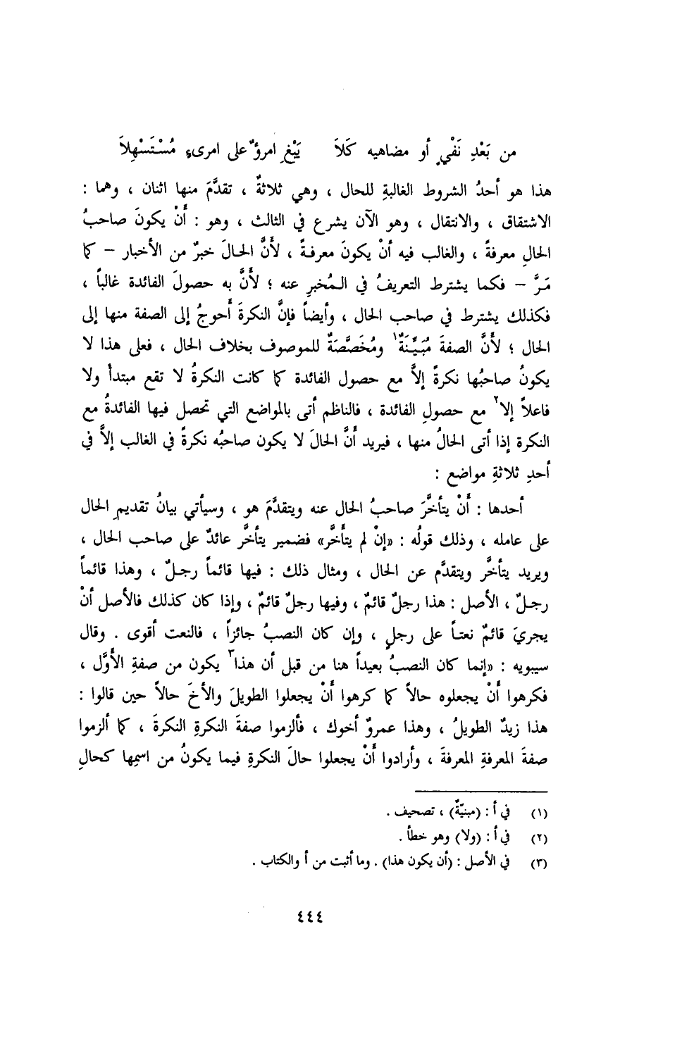 أحدها: أن يتأخر صاحب الحال عنه ويتقدم هو، وسيأتي بيان تقديم الحال على عامله، وذلك قوله: "إن لم يتأخر" فضمير يتأخر عائدٌ على صاحب الحال، ويريد يتأخر ويتقدم عن الحال، ومثال ذلك: فيها قائمًا رجلٌ، وهذا قائمًا رجلٌ، الأصل: هذا رجلٌ قائمٌ، وفيها رجلٌ قائمٌ، وإذا كان كذلك فالأصل أن يجري قائمٌ نعتًا على رجلٍ، وإن كان النصب جائزًا، فالنعت أقوى. وقال سيبويه: "إنما كان النصب بعيدًا هنا من قبل أن هذا يكون من صفة الأول، فكرهوا أن يجعلوه حالًا كما كرهوا أن يجعلوا الطويل والأخ حالًا حين قالوا: هذا زيدٌ الطويل، وهذا عمروٌ أخوك، فألزموا صفة النكرة النكرة، كما ألزموا صفة المعرفة المعرفة، وأرادوا أن يجعلوا حال النكرة فيما يكون من اسمها كحال