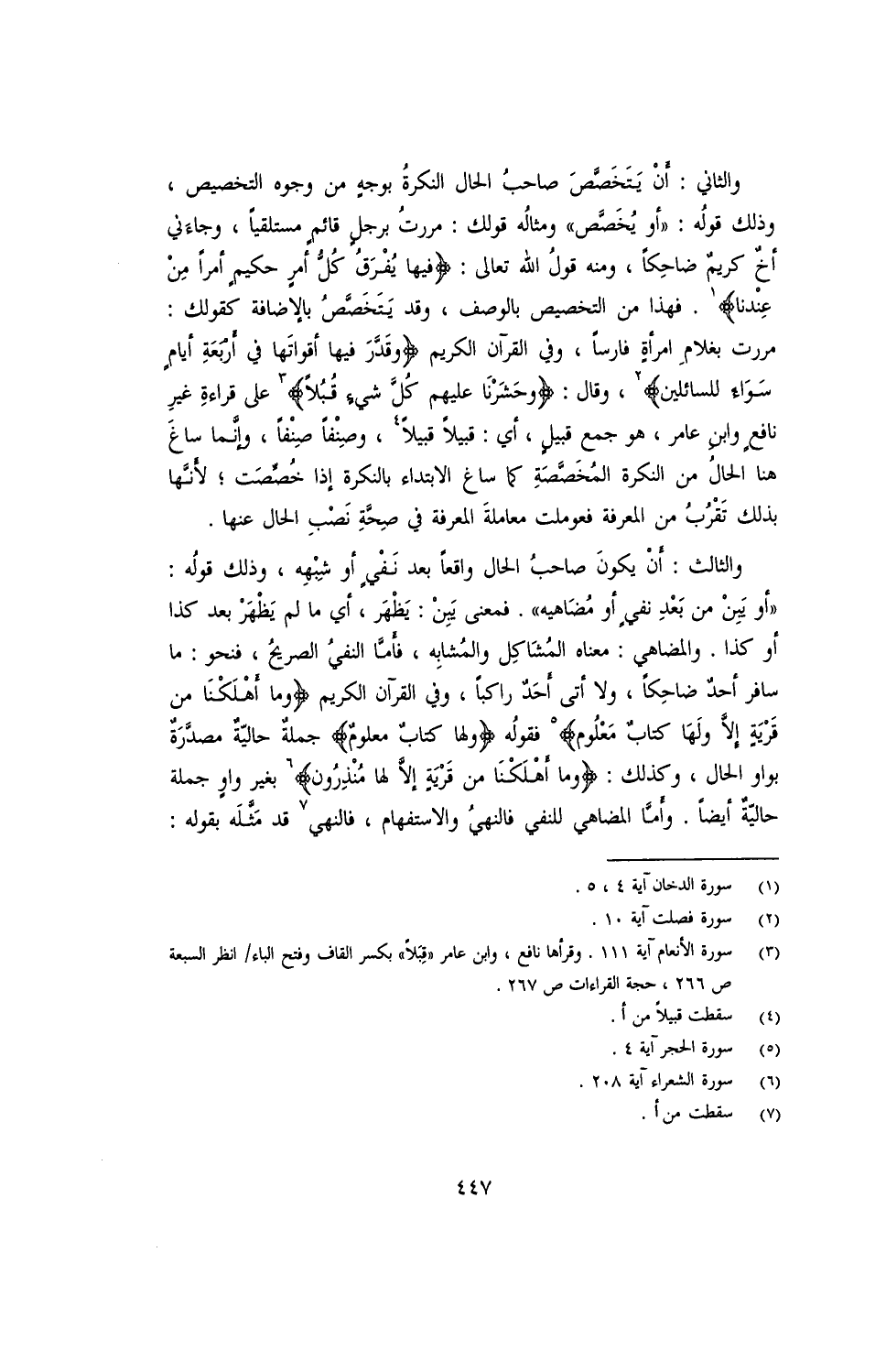 والثالث: أن يكون صاحب الحال واقعًا بعد نفي أو شبهة، وذلك قوله: "أو يبن من بعد نفي أو مضاهية". فمعنى يبن: يظهر، أي ما لم يظهر بعد كذا أو كذا. والمضاهي: معناه المشاكل والمشابه، فأما النفي الصريح، فنحو: ما سافر أحد ضاحكًا، ولا أتى أحدٌ راكبًا، وفي القرآن الكريم {وما أهلكنا من قريةٍ إلا ولها كتابٌ معلوم} فقوله: {ولها كتابٌ معلومٌ} جملة حالية مصدرة بواو الحال، وكذلك: {وما أهلكنا من قريةٍ إلا لها منذرون} بغير واوٍ جملة حالية أيضًا. وأما المضاهي للنفي فالنهي والاستفهام، فالنهي قد مثله بقوله: