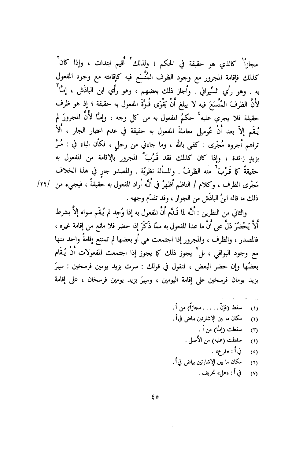 مجازًا كالذي هو حقيقة في الحكم؛ ولذلك أُقِيم ابتدات$, وإذا كان كذلك فإقامة المجرور مع وجود الظرف المتّسَع فيه كإقامته مع وجود المفعول به. وهو رأي السيرافي. وأجاز ذلك بعضهم, وهو رأي ابن الباذش, إمّا لأنّ الظرف المتّسع فيه لا يبلغ أن يقوى قوةَ المفعول به حقيقة؛ إذ هو ظرف حقيقة فلا يجري عليه حكم المفعول به من كل وجه, وإمّا لأنّ المجرورَ لم يُقَم إلا بعد أن عُومل معاملة المفعول به حقيقة في عدم اعتبار الجار, ألَا تراهم أجروه مُجرى: كفى بالله, وما جاءني من رجلٍ, فكأن الباءَ في: مُرَّ بزيدٍ زائدة, وإذا كان كذلك فقد قَرُبَ المجرور بالإقامة من المفعول به حقيقة كما قَرُبَ منه الظرف. والمسألة نظرية. والمصدر جارٍ في هذا الخلاف مجرى الظرف, وكلام/ الناظم أظهر في أنّه أراد المفعول به حقيقةً, فيجيء من ذلك ماقاله ابن الباذش من الجواز, وقد تقدّم وجهه.