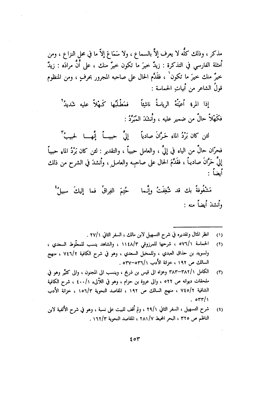 مذكر، وذلك كله لا يعرف إلا بالسماع، ولا سماع إلا ما في محل النزاع، ومن أمثلة الفارسي في التذكرة: زيد خير ما تكون خير منك، على أن مراده: زيد خير منك خير ما تكون، فقدم الحال على صاحبه المجرور بحرفٍ، ومن المنظوم قول الشاعر من أبيات الحماسة: