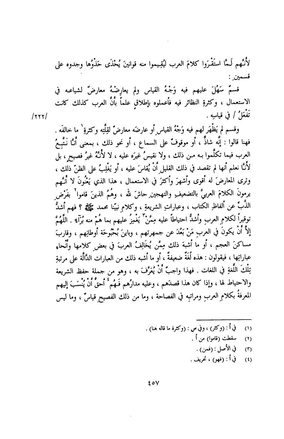 وقسم لم يظهر لهم فيه وجه أو عرضه معرض لقلته وكثرة ما خالفه. فهنا قالوا: إنه شاذ، أو موقوف على السماع، أو نحو ذلك، بمعنى أننا نتبع العرب فيما تكلموا به من ذلك، ولا نقيس غيره عليه، لا لأنه غير فصيحٍ، بل لأنًا نعلم أنها لم تقصد في ذلك القليل أن يُقاس عليه، أو يُغلب على الظن ذلك، وترى المعارض له أقوى وأشهر وأكثر في الاستعمال، هذا الذي يعون لا أنهم يرمون الكلام العربي بالتضعيف والتهجين حاش لله، وهم الذين قاموا بفرض الذب عن ألفاظ الكتاب، وعبارات الشريعة، وكلام نبينا محمد صلى الله عليه وسلم؟ فهم أشد توقيرًا لكلام العرب وأشد احتياطًا عليه ممن يغمز عليهم بما هم منه بُراء. اللهم إلا أن يكون في العرب من بعد عن جمهرتهم، وباين بحبوحة أوطانهم، وقارب مساكن العجم، أو ما أشبه ذلك ممن يخالف العرب في بعض كلامها وأنحاء عباراتها، فيقولون: هذه لغة ضعيفة، أو أشبه بذلك من العبارات الدالة على مرتبة تلك اللغة في اللغات. فهذا واجب أن يُعرف به، وهو من جملة حفظ الشريعة والاحتياط لها، وإذا كان هذا قصدهم، وعليه مدارهم فهم أحق أن يُنسب أليهم المعرفة بكلام العرب ومراتبه في الفصاحة، وما من ذلك الفصيح قياس، وما ليس