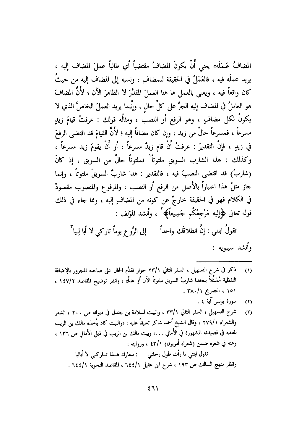 المضاف عمله" سعني أن يكون المضاف مقتضيًا أي طالبًا عمل المضاف إليه، يريد عمله فيه، فالعمل في الحقيقة للمضاف، ونسبة إلى المضاف إليه من حيث كان واقعًا فيه، ويعني بالعمل هاهنا العمل المقدر لا الظاهر الآن؛ لأن المضاف هو العامل في المضاف إليه الجر على كل حال، وإنما يريد العمل الخاص الذي لا يكون له مضاف، وهو الرفع أو النصب، ومثاله قولك: عرفت قيام زيد مسرعًا، فمسرعًا حال من زيد، وإن كان مضافًا إليه؛ لأن القيام قد اقتضى الرفع في زيد، فإن التقدير: عرفت أن قام زيد مسرعًا، أو أن يقوم زيد مسرعًا، وكذلك: هذا الشارب السويق متلوتا فمتلوتًا حال من السويق، إذ كان (شارب) قد اقتضى النصب فيه، فالتقدير: هذا شارب السويق ملتوتًا، وإنما جاز هذا اعتبارًا بالأصل من الرفع أو النصب، والمرفوع والمنصوب مقصود في الكلام فهو في الحقيقة خارج عن كونه من المضاف إليه، ومما جاء في ذلك قوله تعالى: {إليه مرجعكم جميعًا}، وأنشد المؤلف: