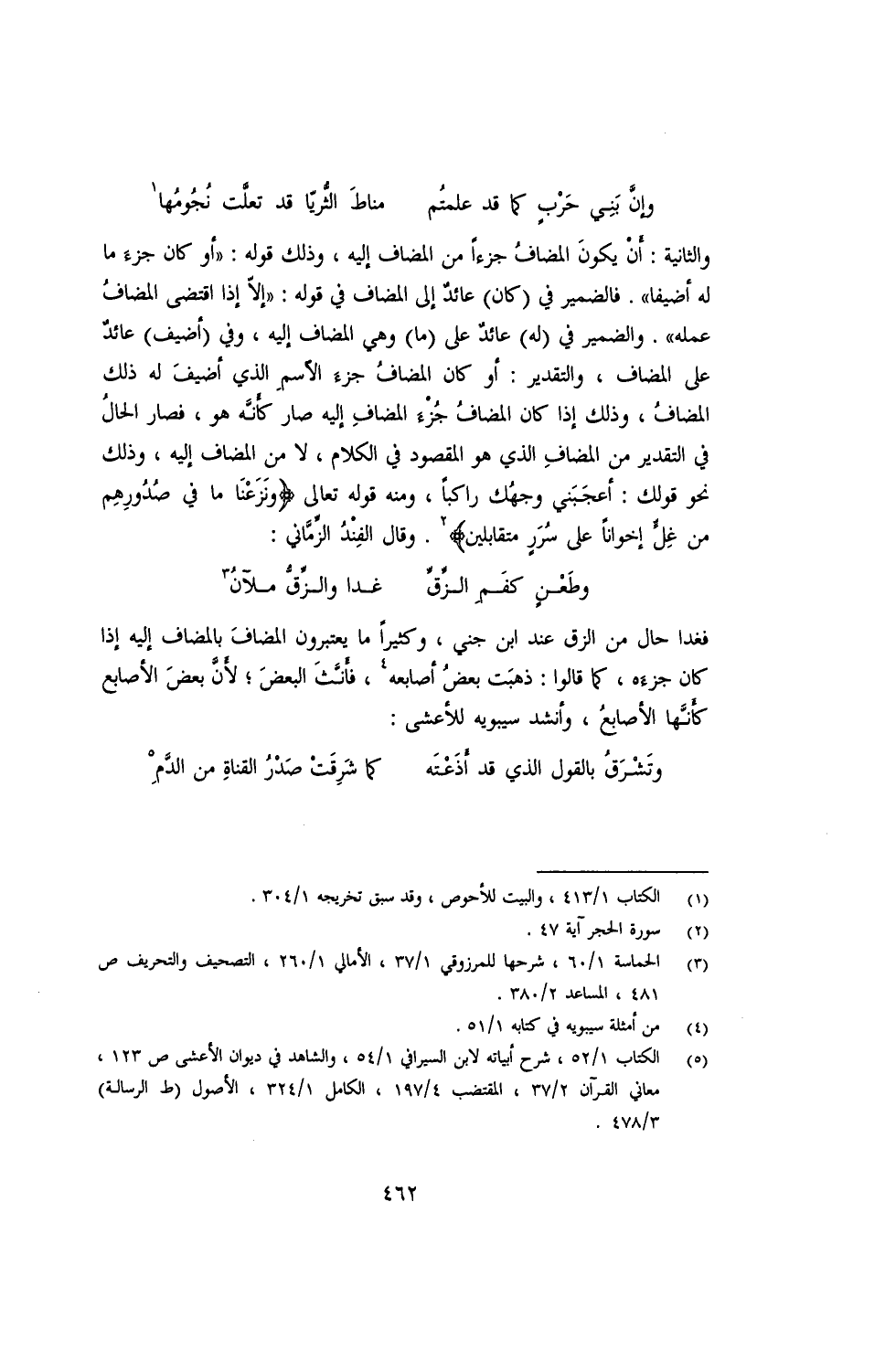 والثانية: أن يكون المضاف جزءًا من المضاف إليه، وذلك قوله: "أو كان جزء ما له أضيفا". فالضمير في (كان) عائد إلى المضاف إليه في قوله: "إلا إذا اقتضى المضاف عمله". والضمير في (له) عائد على (ما) وهي المضاف إليه، وفي (أضيف) عائد على المضاف، والتقدير: أو كان المضاف جزء الاسم الذي أضيف له ذلك المضاف، وذلك إذا كان المضاف جزء المضاف إليه صار كأنه هو، فصار الحال في التقدير من المضاف الذي هو المقصود في الكلام، لا من المضاف إليه، وذلك نحو قولك: أعجبني وجهك راكبًا، ومنه قوله تعالى {ونزعنا ما في صدورهم من غل إخوانًا على سرر متقابلين}. وقال الفند الزماني:
