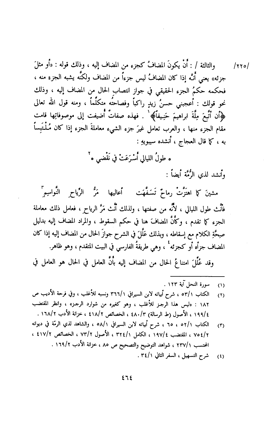 والثالثة: أن يكون المضاف كجزء من المضاف إليه، وذلك قوله: "أو مثل جزئه" يعني أنه إذا كان المضاف جزءًا من المضاف ولكنه يشبه الجزء منه، فحكمه حكم الجزء الحقيقي في جواز انتصاب الحال من المضاف إليه، وذلك نحو قولك: أعجبني حسن زيد راكبًا وفصاحته متكلمًا، ومنه قول الله تعالى {أن اتبع ملة إبراهيم حنيفًا}. فهذه صفات أضيفت إلى موصوفاتها قامت مقام الجزء منها، والعرب تعامل غير جزء الشيء معاملة الجزء إذا كان ملتبسًا به، كما قال العجاج، أنشد سيبويه: