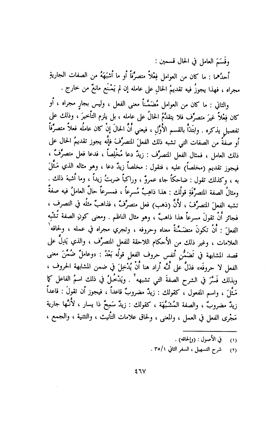 والثاني: ما كان من العوامل مضمنًا معنى الفعل، وليس بجارٍ مجراه، أو كان فعلًا غير متصرف فلا يتقدم الحال على عامله، بل يلزم التأخير، وذلك على تفصيل يذكره. وابتدأ بالقسم الأول، فيعني أن الحال إن كان عامله فعلًا متصرفًا أو صفة من الصفات التي تشبه ذلك الفعل المتصرف فإنه يجوز تقديم الحال على ذلك العامل، فمثال الفعل المتصرف فإنه يجوز تقديم الحال على ذلك العامل، فمثال الفعل المتصرف: زيد دعا مخلصًا، فدعا فعل متصرف، فيجوز تقديم (مخلصًا) عليه، فتقول: مخلصًا زيد دعا، وهو مثاله الذي مثل به، وكذلك تقول: ضاحكًا جاء عمرو، وراكبًا ضربت زيدًا، وما أشبه ذلك. ومثال الصفة المتصرفة قولك: هذا ذاهب مسرعًا، فمسرعًا حال العامل فيه صفة تشبه الفعل المتصرف، لأن (ذهب) فعل متصرف، فذاهب مثله في التصرف، فجائز أن تقول مسرعًا هذا ذاهب، وهو مثال الناظم. ومعنى كون الصفة تشبه الفعل: أن تكون متضمنة معناه وحروفه، وتجري مجراه في عمله، ولحاقه العلامات، وغير ذلك من الأحكام اللاحقة للفعل المتصرف، والذي يدل على قصد المشابهة في تضمن أنفس حروف الفعل قوله بعد: "وعامل ضمن معنى الفعل لا حروفه" فدل على أنه أراد هنا أن يدخل في ضمن المشابهة الحروف، وبذلك فسر في الشرح الصفة التي تشبهه. ويدخل في ذلك اسم الفاعل كما مثل، واسم المفعول، كقولك: زيد مضروب قاعدًا، فيجوز أن تقول: قاعدًا زيد مضروب، والصفة المشبهة، كقولك: زيد سمح ذا يسار، لأنها جارية مجرى الفعل في العمل، والمعنى، ولحاق علامات التأنيث، والتثنية، والجمع،
