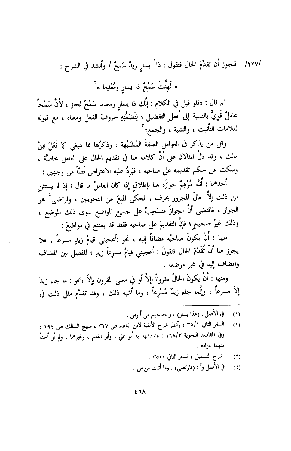 وقيل من يذكر في العوامل المشبهة، وذكرها مما ينبغي كما فعل ابن مالك، وقد دل المثالان على أن كلامه هنا في تقديم الحال على العامل خاصة، وسكت عن حكم تقديمه على صاحبه، فيرد عليه الاعتراض نصًا من وجهين: