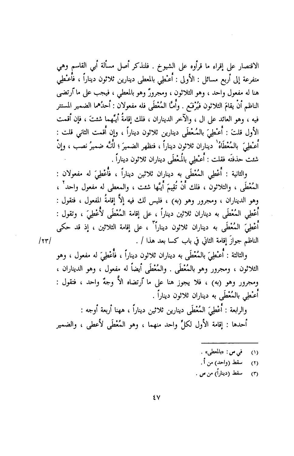 الاقتصار على إقراء ما قرأوه على الشيوخ. فلنذكر أصل مسألة أبي القاسم وهي متفرعة إلى أربع مسائل: الأولى: أعْطِي بالمعطى دينارين ثلاثون دينارًا, فأَعْطِي هنا له مفعول واحد, وهو الثلاثون, ومجرور وهو بالمعطى, فيجب على ما ارتضى الناظم أن يقامَ الثلاثون فيرفع. وأما المُعطى فله مفعولان: أحدهما الضمير المستتر فيه, وهو العائد على ال, والآخر الديناران, فلك إقامة أيها شئت, فإن أقمت الأول قلتَ: أعْطِيَ بالمُعْطَى دينارين ثلاثون دينارًا, وإن أقمت الثاني قلت: أعْطِيَ بالمُعطاهُ ديناران وثلاثون دينارًا, فتظهر الضميرَ؛ لأنّه ضمير نصب, وإن شئت حذفته فقلت: أعْطِي بالمُعطَى ديناران ثلاثون دينارًا.
