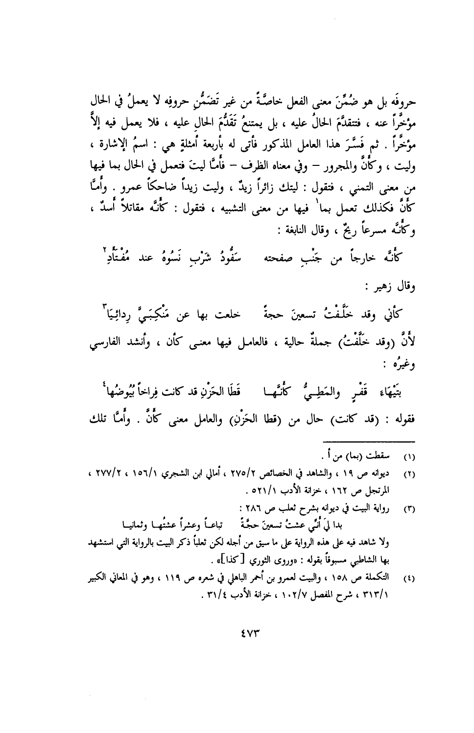 حروفه بل ضمن معنى الفعل خاصة من غيرتضمن حروفه لا يعمل في الحال مؤخرًا عنه، فتقدم الحال عليه، بل يتمنع تقدم الحال عليه، فلا يعمل فيه إلا مؤخرًا. ثم فسر هذا العامل المذكور فأتى له بأربعة أمثلة هي: اسم إشارة، وليت، وكأن المجرور- وفي معناه الظرف- فأما ليت فتعمل في الحال بما فيها من معنى التمني، فتقول: ليتك زائرًا زيد، وليت زيد ضاحكًا عمرو. وأما كأن فكذلك تعمل بما فيها من معنى التشبيه، فتقول: كأنه مقاتلًا أسد، وكأنه مسرعًا ريح، وقال النابغة: