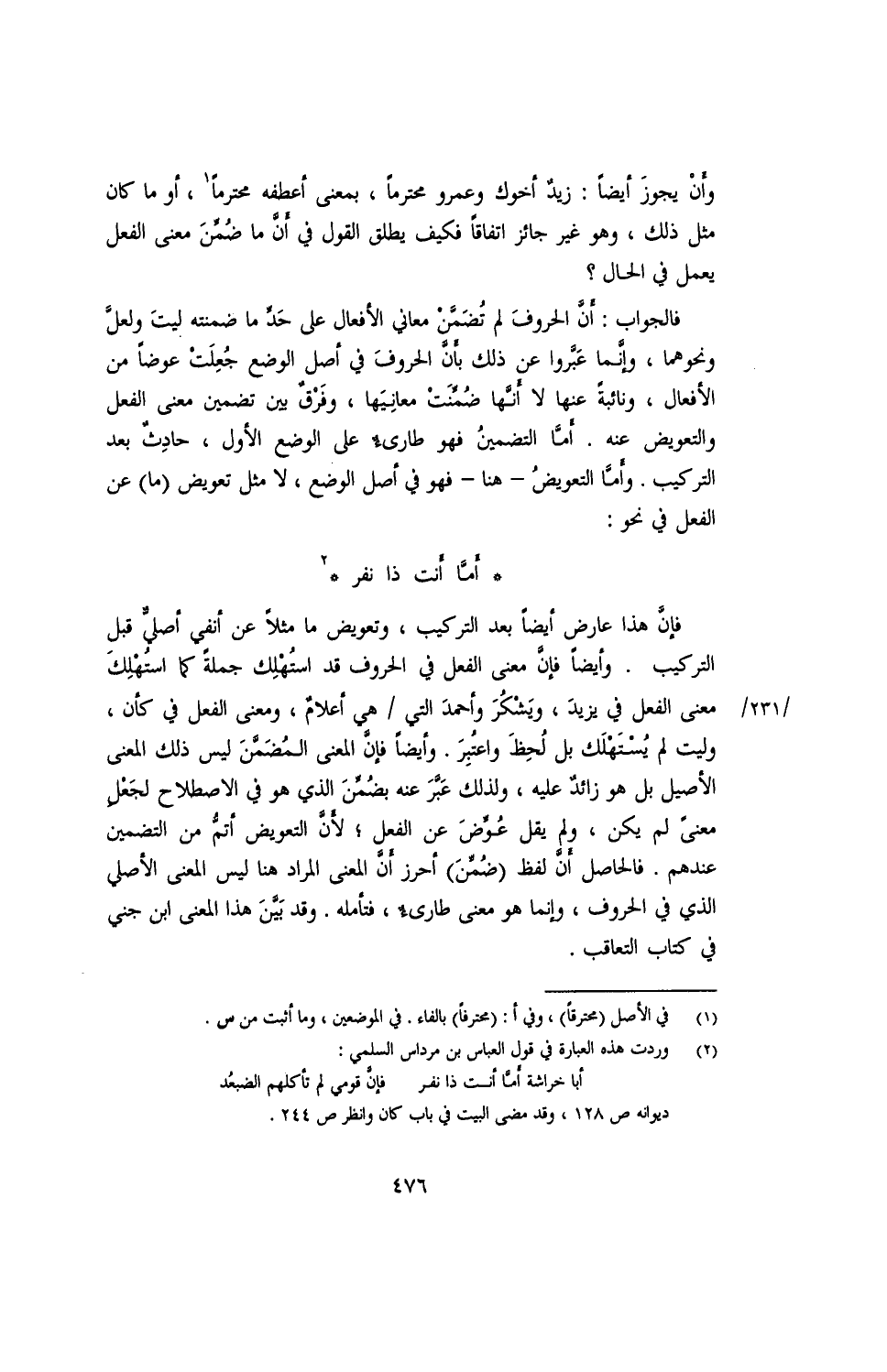 فإن هذا عرض أيضًا بعد التركيب، وتعويض ما مثلًا عن أنفي أصلي قبل التركيب. وأيضًا فإن معنى الفعل في الحروف قد استهلك جملة كما استهلك معنى الفعل من يزيد، ويشكر وأحمد التي/ هي أعلام، ومعنى الفعل في كأن، وليت لم يستهلك بل لُحظ واعتبر. وأيضًا فإن المعنى المضمن ليس ذلك المعنى الأصيل بل هو زائد عليه، ولذلك عبر عنه بضمن الذي هو في الاصطلاح لجعل معنى لم يكن، ولم يقل عوض عن الفعل؛ لأن التعويض أتم من التضمين عندهم. فالحاصل أن لفظ (ضمن) أحرز أن المعنى المراد هنا ليس المعنى الأصلي الذي في الحروف، وإنما هو معنى طارئ، فتأمله. وقد بين هذا المعنى ابن جني في كتاب التعاقب.