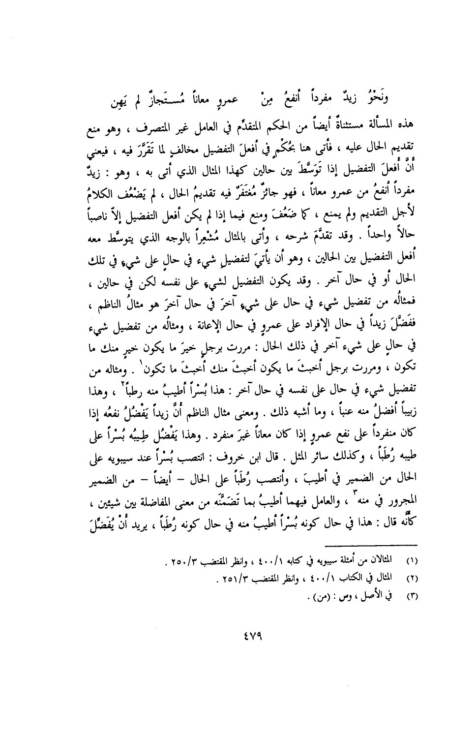 هذه المسألة مستثناه أيضًا من الحكم المتقدم في العامل غير المتصرف، وهو منع تقديم الحال عليه، فأتى هنا بحكم في أفعل التفضيل مخالف لما تقرر فيه، فيعني أن أفعل التفضيل إذا توسط بين حالين كهذا المثال الذي أتى به، وهو: زيد مفردًا أنفع من عمرو معانًا، فهو جائز مغتفر فيه تقديم الحال، لم يضعف الكلام لأجل التقديم ولم يمنع، كما ضعف ومنع فيما إذا لم يكن أفعل التفضيل إلا ناصبًا حالًا واحدًا. وقد تقدم شرحه، وأتى بالمثال مشعرًا بالوجه الذي يتوسط معه أفعل التفضيل بين الحالين، وهو أن يأتي لتفضيل شيء في حال على شيء في تلك الحال أو في حال آخر. وقد يكون التفضيل لشيء على نفسه لكن في حالين، فمثاله من تفضيل شيء في حال على شيء آخر في حال آخر هو مثال الناظم، ففضل زيدًا في حال الإفراد على عمرو في حال الإعانة، ومثاله من تفضيل شيء في حال على شيء آخر في ذلك الحال: مررت برجل خير ما يكون خير منك ما تكون، ومررت برجل أخبث ما يكون أخبث منك أخبث ما تكون. ومثاله من تفضيل شيء في حال على نفسه في حال آخر: هذا بسرا أطيب منه رطبًا، وهذا زبيبًا أفضل منه عنبًا، وما شبه ذلك. ومعنى مثال الناظم أن زيدًا يفضل نفعه إذا كان مفردًا على نفع عمرو إذا كان معانًا غير منفرد. وهذا يفضل طيبة بسرًا على طيبة رطبًا، وكذلك سائر المثل. قال ابن خروف: انتصب بسرًا ع سيبويه على الحال من الضمير في أطيب، وأنتصب رطبًا على الحال- أيضًا- من الضمير المجرور في منه، والعامل فيهما أطيب بما تضمنه من معنى المفاضلة بين شيئين، كأنه قال: هذا في حال كونه بسرًا أطيب منه في حال كونه رطبًا، يريد أن يفضل