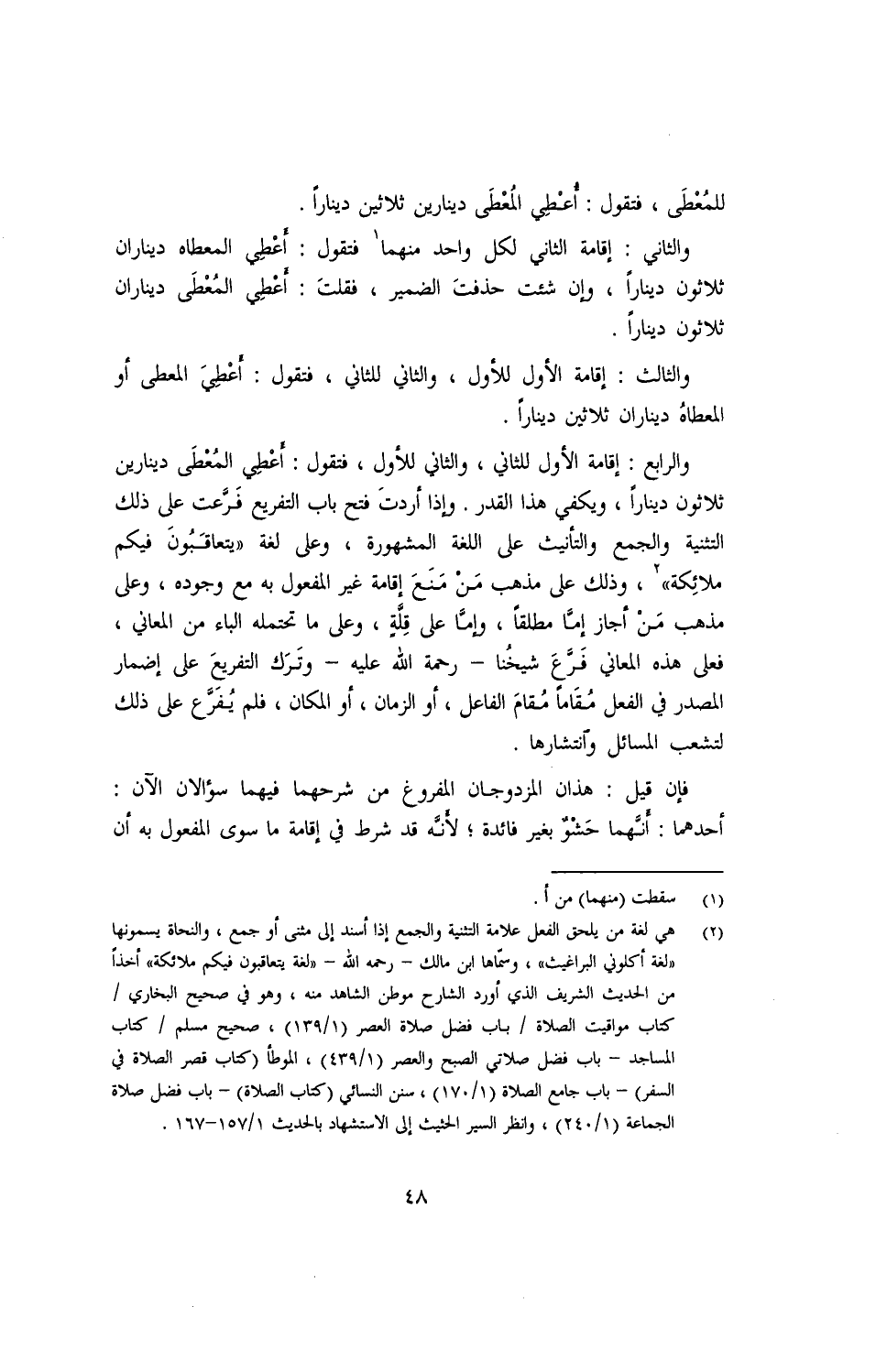 والثاني: إقامة الثاني لكل واحد منهما فتقول: أَعطِي المعطاه ديناران ثلاثون دينارًا, إن شئت حذفت الضمير, فقلت: أعْطِي المُعطى ديناران ثلاثون دينارًا.