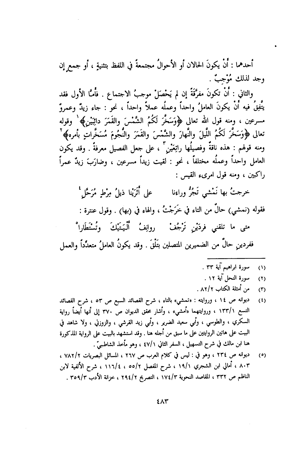 والثاني: أن تكون مفرقة إن لم يحصل موجب الاجتماع. أما الأول فقد يتفق فيه أن يكون العامل واحدًا وعمله عملًا واحدًا، نحو: جاء زيد وعمرو مسرعين، ومنه قول الله تعالى {وسخر لكم الشمس والقمر دائبين} وقوله تعالى {وسخر لكم الليل والنهار والشمس والقمر والنجوم مسخرات بأمره} ومنه قولهم: هذه ناقة وفصيلها راتعين، على جعل الفصيل معرفة. وقد يكون العامل واحدًا وعمله مختلفًا، نحو: لقيت زيدًا مسرعين، وضار زيد عمرًا راكبين، ومنه قول أمريء القيس: