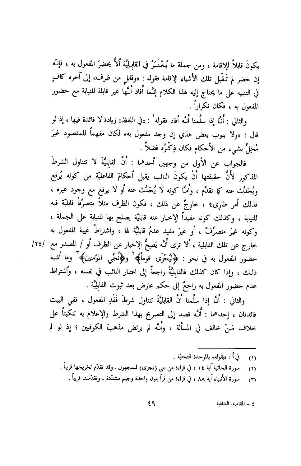 فالجواب عن الأول من وجهين أحدهما: أنّ القابليّة لا تتناول الشرطَ المذكور لأنّ حقيقتها أن يكون النائب يقبل أحكامَ الفاعليّة من كونه يُرفع ويحدّث عنه كما تقدّم, وأمّا كونه لا يُحدّث عنه أو لا يرفع مع وجوده غيره, فذلك أمر طارئ, خارجٌ عن ذلك, فكون الظرف مثلًا متصرفًا قابليّة فيه للنيابة, وكذلك كونه مفيدًا الإخبار عنه قابليّة يصلح بها للنيابة على الجملة, وكونه غيرَ متصرف, أو غير مفيد عدمُ قابليّة لها, واشتراط غيبة المفعول به خارج عن تلك القابلية, ألا ترى أنه يصح الإخبار عن الظرف أو/ المصدر مع حضور المفعول به في نحو: {ليُجزى قومًا} و {نُجِّي المؤمنين} وما أشبه ذلك, وإذا كان كذلك فالقابليّة راجعةٌ إلى اعتبار النائب في نفسه, واشتراط عدم حضور المفعول به راجعٌ إلى حكم عارض بعد ثبوت القابليّة.