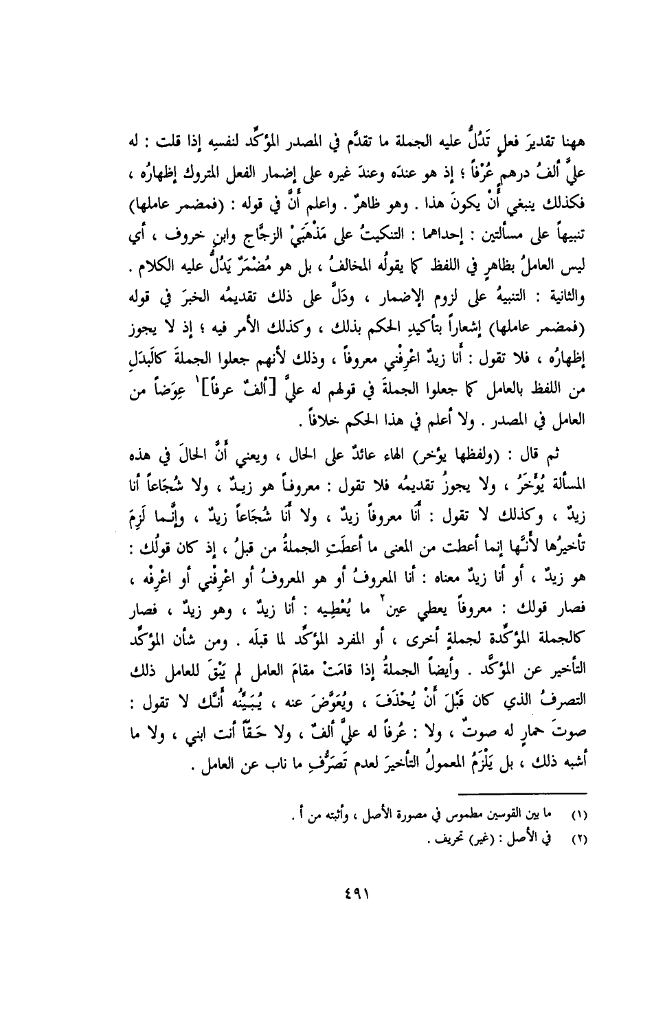 ثم قال: (ولفظها يؤخر) الهاء عائد على الحال، ويعني أن الحال في هذه المسألة يؤخر، ولا يجوز تقديمه فلا تقول: معروفًا هو زيد، ولا شجاعًا أنا زيد، وكذلك لا تقول: أنا معروفًا زيد، ولا أنا شجاعًا زيد، وإنما لزم تأخيرها لأنها إنما أعطت من المعنى ما أعطت الجملة من قبل، إذ كان قولك: هو زيد، أو أنا زيد معناه: أنا المعروف أو هو المعروف أو أعرفني أو أعرفه، فصار قولك: معروفًا يعطي عين ما يعطيه: أنا زيد، وهو زيد، فصار كالجملة المؤكدة لجملة أخرى، أو المفرد المؤكد لما قبله. ومن شأن المؤكد التأخير عن المؤكد. وأيضًا الجملة إذا قامت مقام العامل لم يبق للعامل ذلك التصرف الذي كان قبل أن يُحذف، ويُعوض عنه، يُبينه أنك لا تقول: صوت حمارٍ له صوت، ولا: عرفًا له على ألف، ولا حقًا أنت ابني، ولا ما أشبه ذلك، بل يلزم المعمول التأخير لعدم تصرف ما ناب عن العامل.