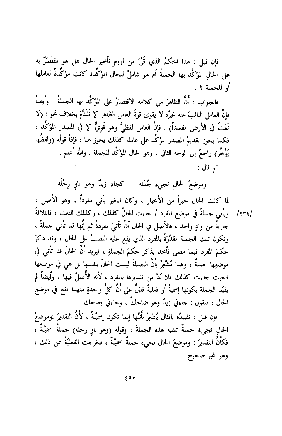 فإن قيل: هذا الحكم الذي قرر من لزوم تأخير الحال هل هو مقتصر به على الحال المؤكد بها الجملة أم هو شامل للحال المؤكدة كانت مؤكدة لعاملها أو للجملة؟ .